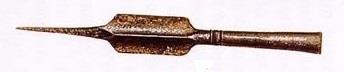 Пятое - копье для противовеса острию имело тяжелый подток с острием на пятке, а длинное древко было составным и две половинки соединялись короткой железной трубкой.
