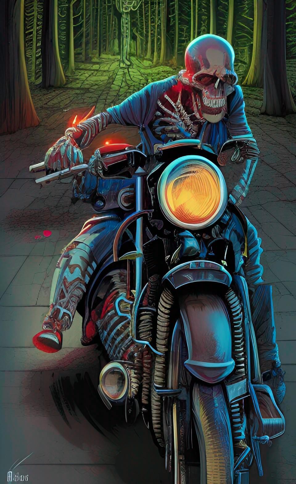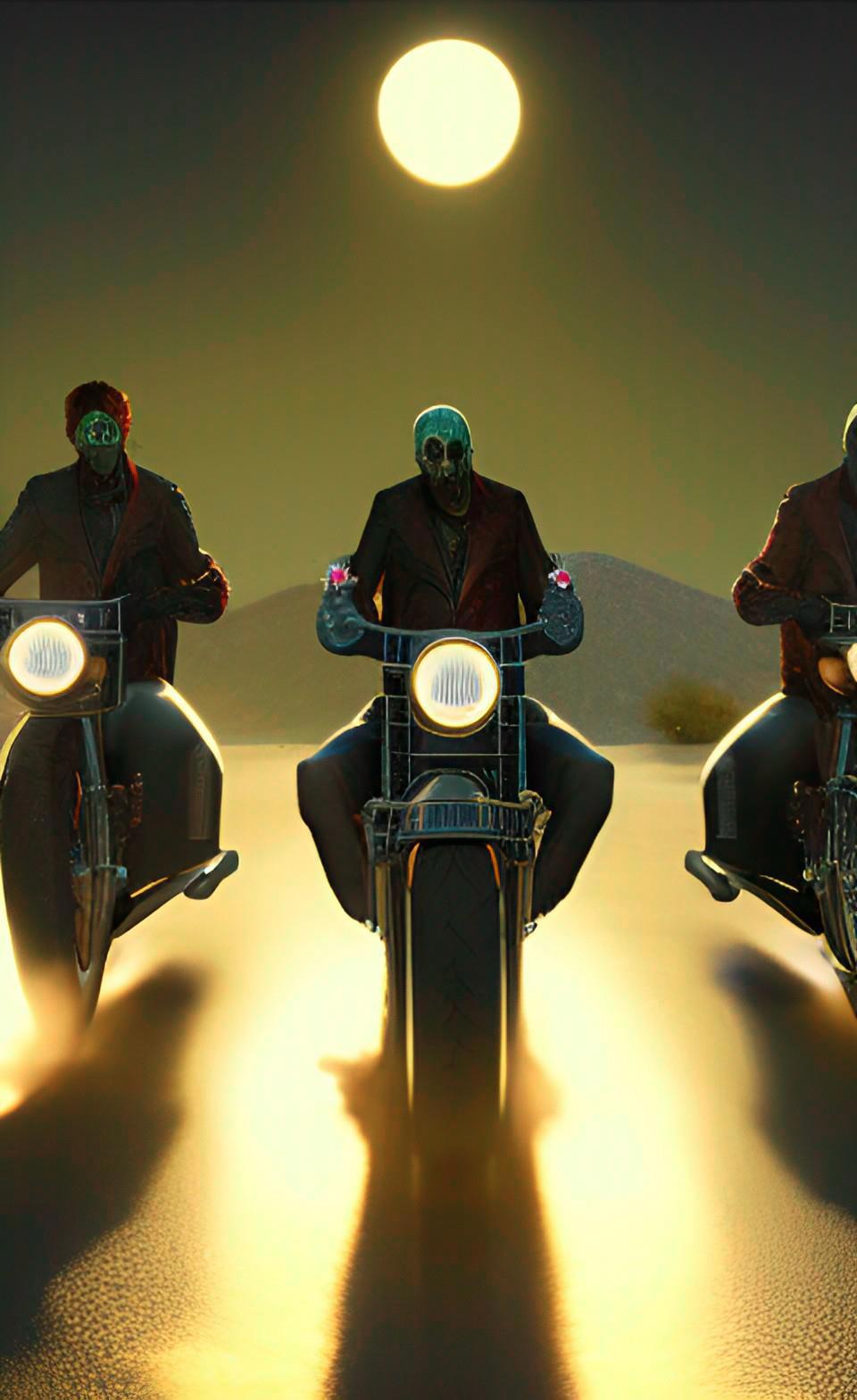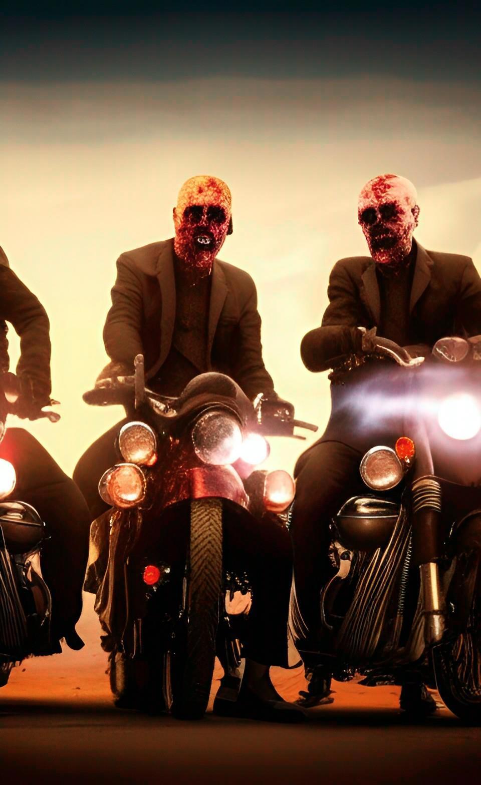 В первый раз - когда решил попробовать нарисовать обложку книги "Гена Портер и Зловещие Мертвецы" путем нейросети. Не той, которой многие тут, на АТ, балуются - там нужно регистрироваться, нашел нейросеть, где можно рисовать без регистрации. И решил нарисовать зомби-байкеров, как один из самых красочных для изображения эпизодов книги. И вот что получилось: