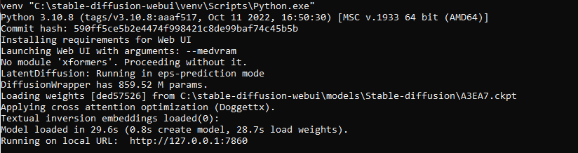 10. Запускаем скрипт webui.bat двойным щелчком мыши, и ждём. В первый запуск будет скачана куча дополнительных файлов, так что ждать придётся некоторое время. И да - комп будет сильно тормозить, так что лучше временно его не трогать.