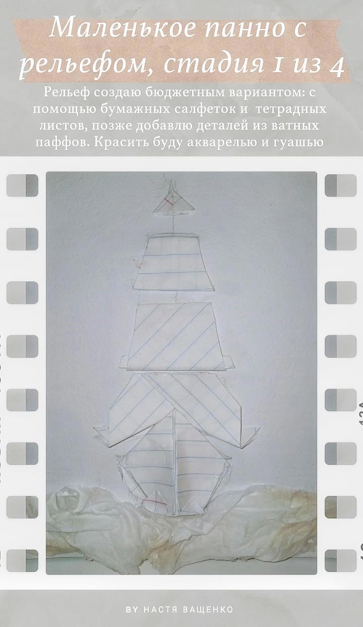 Для маленького панно (или барельефа? Как правильнее,если я не планирую это вешать на стену, но сам формат — это рельеф, интерьерный декор и объёмная рама?) я выбрала сюжет с кораблём в море на фоне нежного неба. Фон будет акварельный. Для рельефа отобрала бумагу из тетради, салфетку и чуть позже в дело вступят паффы (это как ватные диски только плотнее)