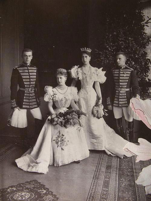 Принцесса Мария Румынская и герцогиня Виктория-Мелита Гессен-Дармштадтская со своими пажами во время коронационных торжеств в Москве, 1896 год.