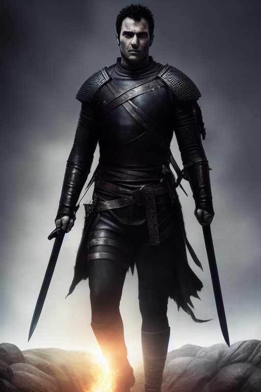 Да и результат не идеальный. Непонятно откуда возникает свет на картинке. Вечная проблема с пальцами. Да и мелкие детали мне пришлось править в фотошопе. Вот например ножны, меч и шрам я сам подрисовывал.