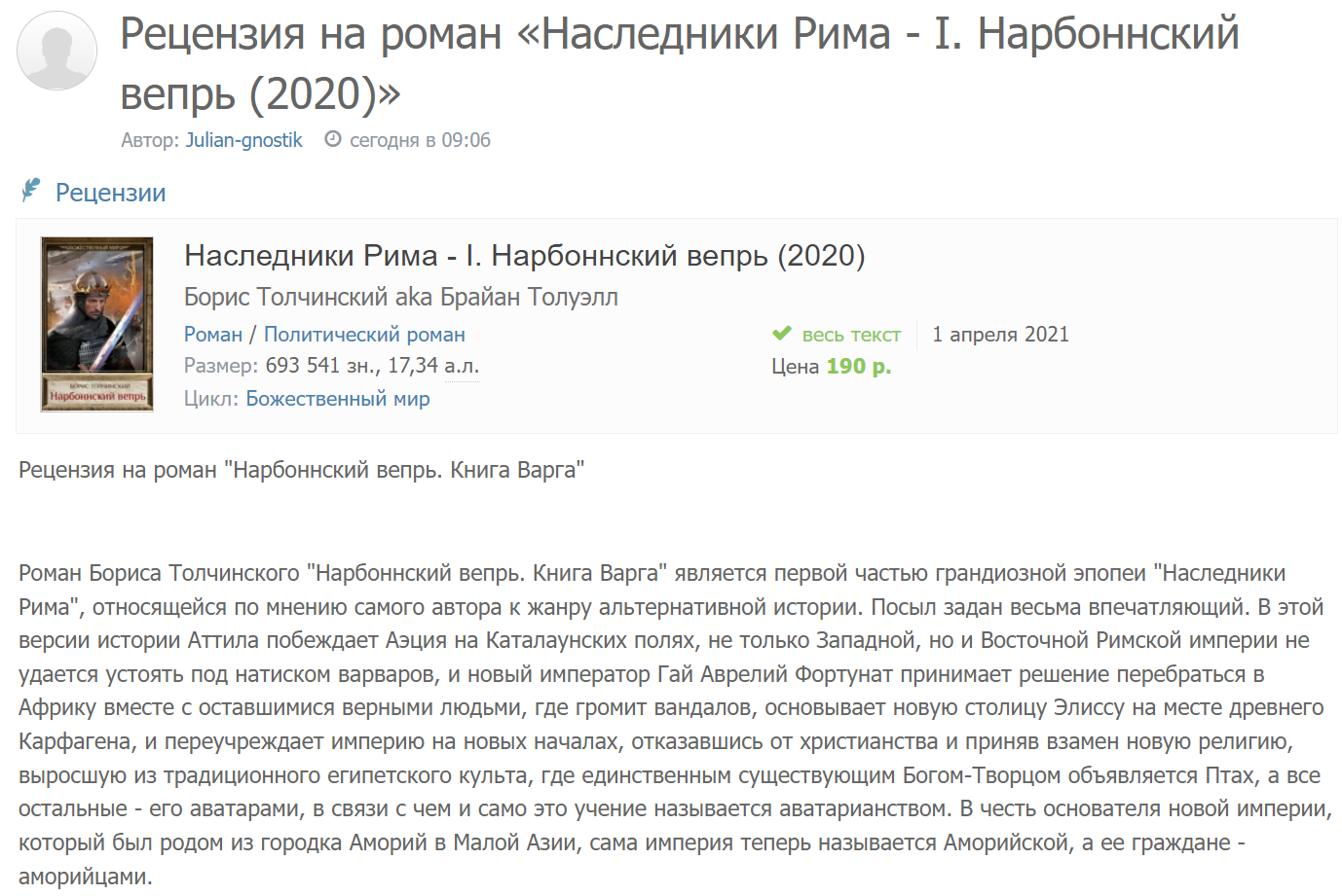 Автор: Борис Толчинский aka Брайан ТолуэллНовая большая рецензия, первая для моих книг в наступившем году, от ув. Julian-gnostik, за что ему огромное спасибо. На скриншотах - начало и конец рецензии, ниже - мои ремарки.