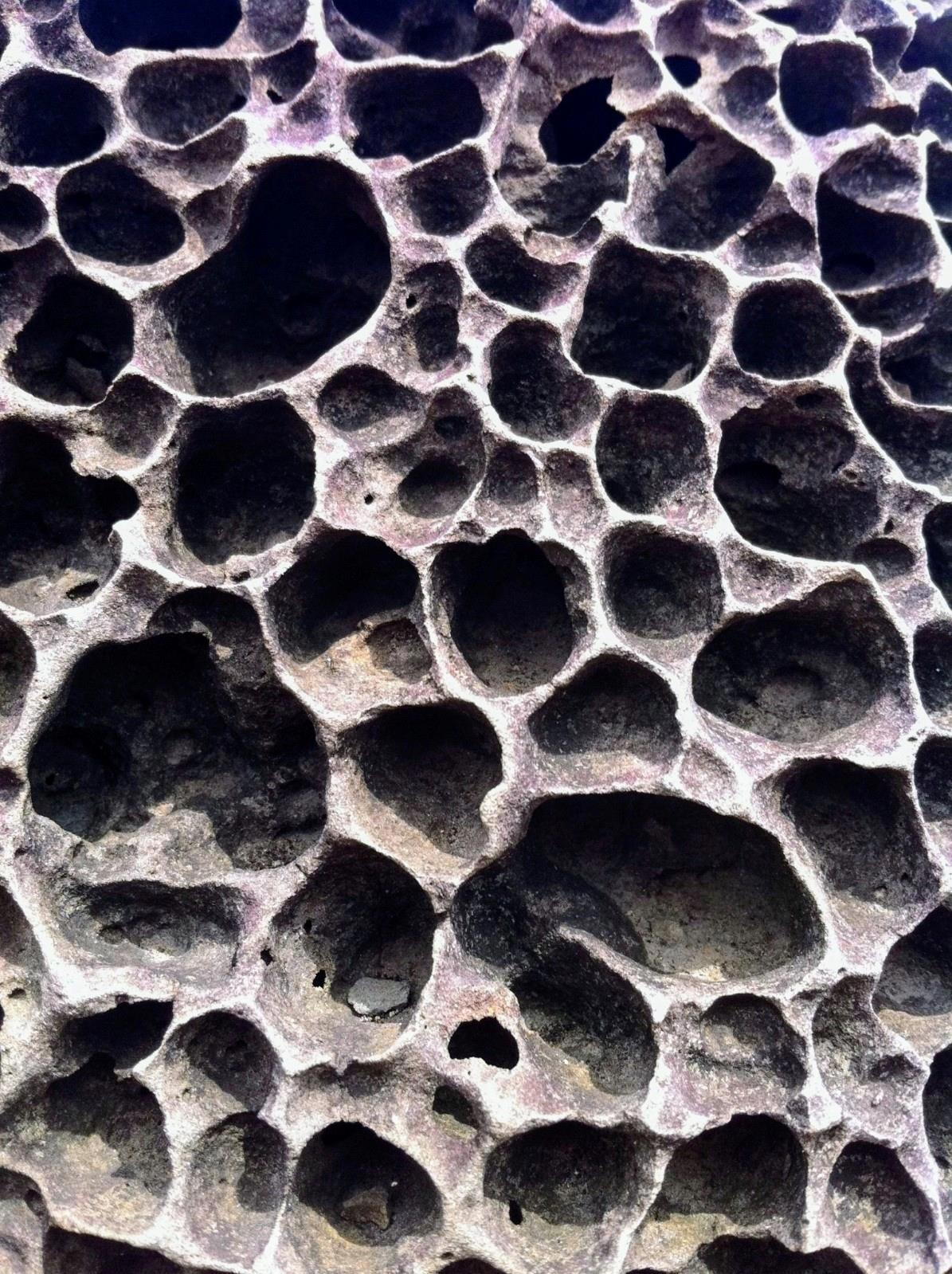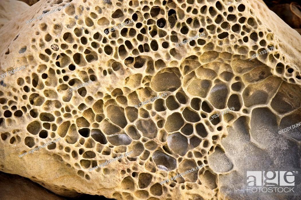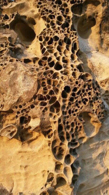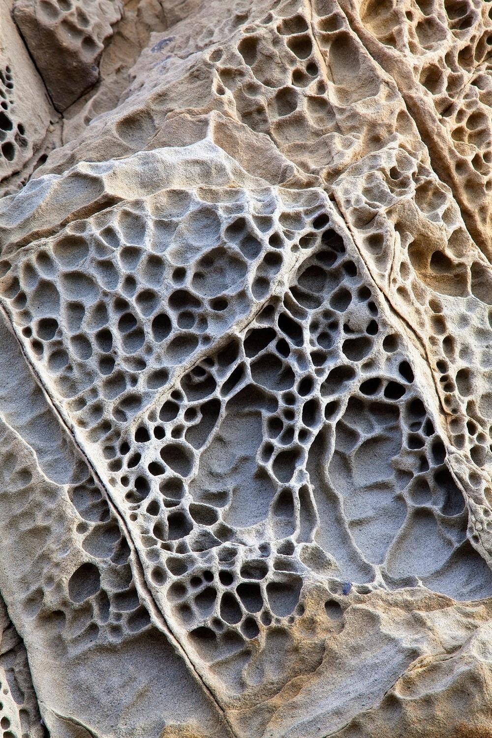 Интересные образования тафони в песчанике формации Пиджен Пойнт на государственном пляже Бин Холлоу в округе Сан-Матео, Калифорния