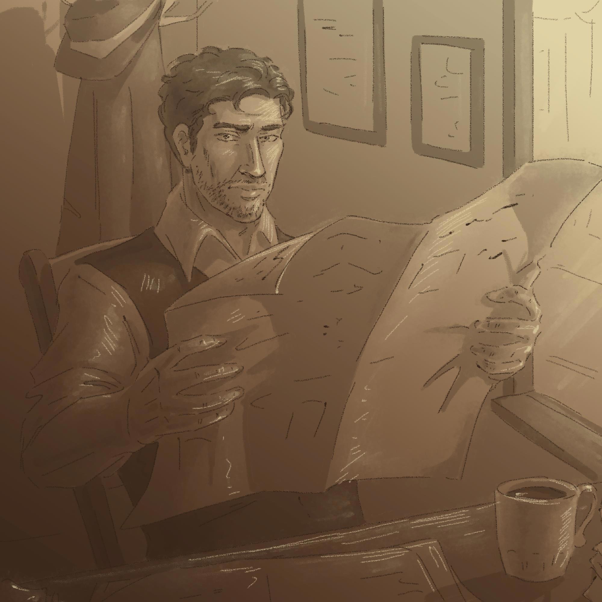 Воть. Это Алпин Фарелл. Шеф-искатель, который, собственно и владеет Чайным домиком и газетой «Королевский вестник». Вы только посмотрите на его недовольное лицо. Не иначе он только что вошел в общий зал через окно и увидел, что все его охламоны расслабленно гоняют чаи вместо того, чтобы думать, чем заполнить «подвал» на третьей полосе, зависший после остановки рекламы местной гуталиновой фабрики.
