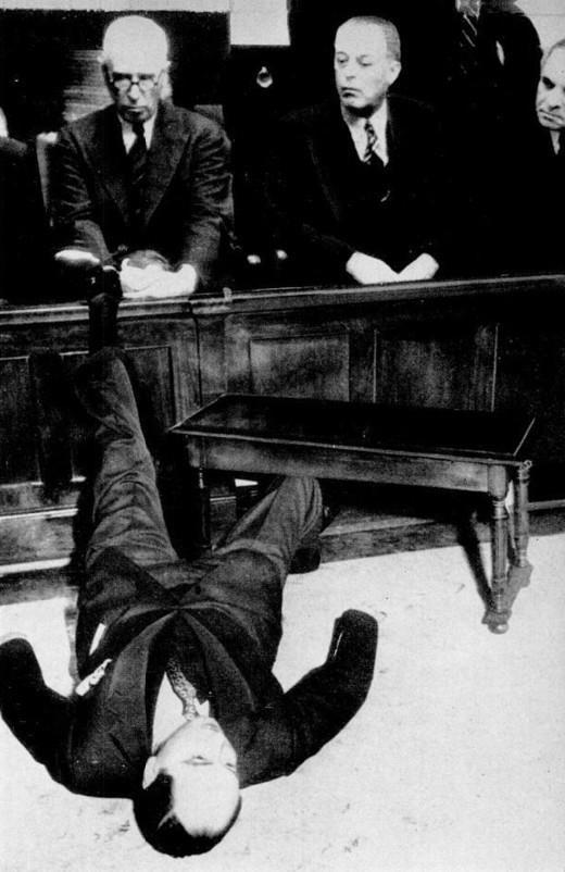 Недостойное правосудие - вот смысл этой сцены из зала суда Лос-Анджелеса, где адвокат Пола Райта внезапно падает навзничь, чтобы показать присяжным, как жертва его клиента упала ." Нацисты говорят немцам, что США - это “нация гангстеров”.
