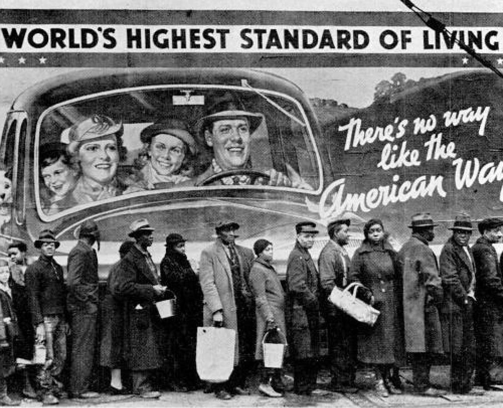 Вывеска ”Путь по-американски“ с такой же очередью, как эта, сделанная во время наводнения в Миссисипи (например, 15 февраля 1937 года), была переиздана министром пропаганды Геббельсом в "Der Angriff" 5 ноября с комментарием: "Слава Богу, у нас есть лучший путь”.