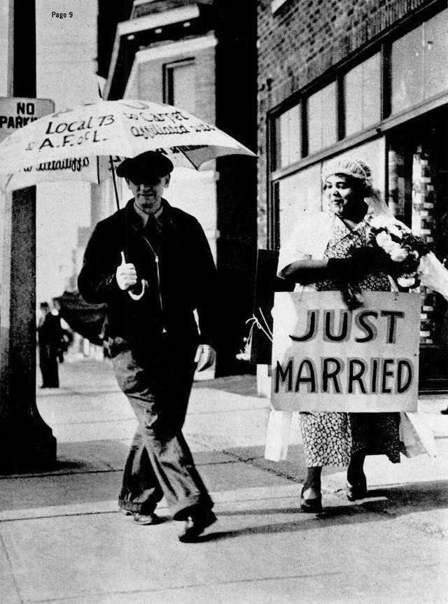 Трудовые проблемы смешны, говорят нацисты, которые подавили великие донацистские профсоюзы Германии. На этой фотографии изображен профсоюзный пикет в Сент-Луисе, которого его босс пытался пристыдить, наняв негритянку, чтобы она маршировала взад и вперед рядом с ним. Подпись на немецком языке гласит: “Пикет не позволил этому остановить его".