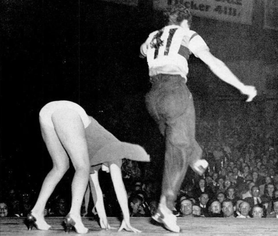 Джиттербаги - идеальная тема для нацистских сатириков. Подпись на немецком языке гласит: “На американских танцевальных конкурсах дикие изгибы являются стандартной частью программы. На подобном конкурсе в Лос-Анджелесе одна из танцовщиц маршировала на четвереньках и пыталась таким образом повлиять на судей."