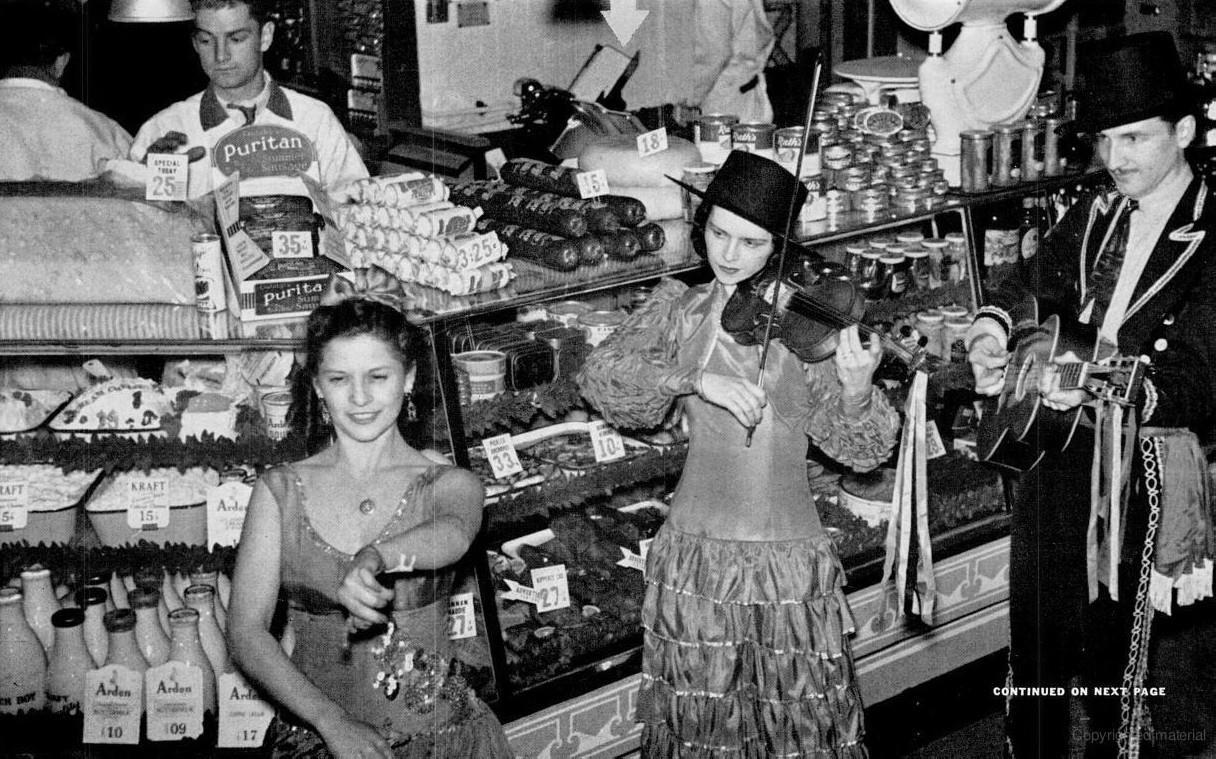 Фандангос и салями были предложены щекой к щеке (бок к боку) на открытии Rancho Pico, супермаркета в Лос-Анджелесе. Супермаркеты, опасаясь, что их покупатели стали слишком пресыщенными, чтобы их привлекали обычные прожекторные дисплеи, теперь устраивают уличные шоу с распродажами по выходным. Тот самый Отто К. Компания Olesen Illuminating Co., которая поставляет прожекторы, также производит проекторы для напольных шоу.