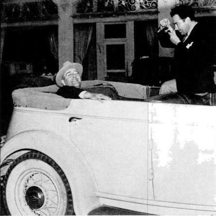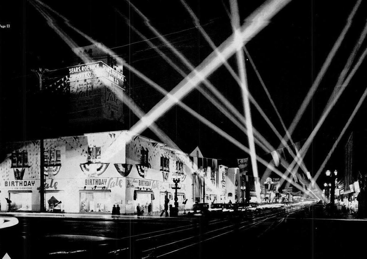 Пышность и условности сопровождают почти каждое публичное мероприятие в Голливуде, где ни одна ночь не является полной, если ее не освещают батареи больших прожекторов. Все открытия, будь то фильмы стоимостью в миллион долларов или сигарные магазины на углу, считаются достаточно важными, чтобы отмечать их при свете прожекторов. Сцена выше не является экстраординарным событием, просто обычная вечеринка по случаю дня рождения в Сирс, Робак.