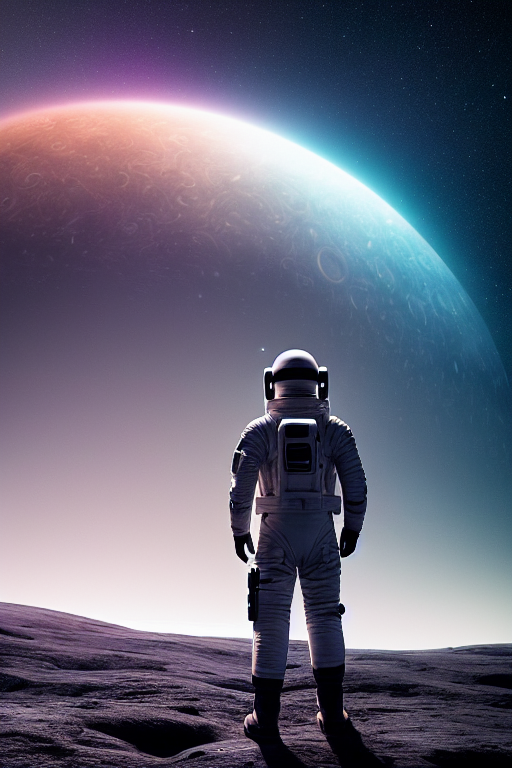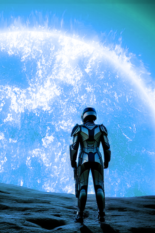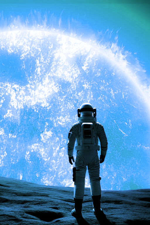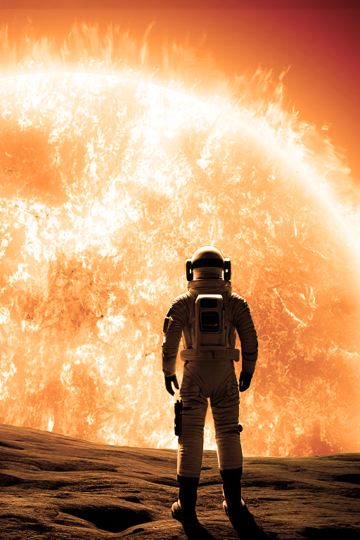 Человек в скафандре(фантастическом, не современного образца) стоит на серой пустынной планете(выглядит как Луна) и смотрит вдаль за горизонт. А там во все небо растянулась огромная звезда с темными пятнами, завихрениями и протуберанцами, как на фотографиях солнца вблизи.