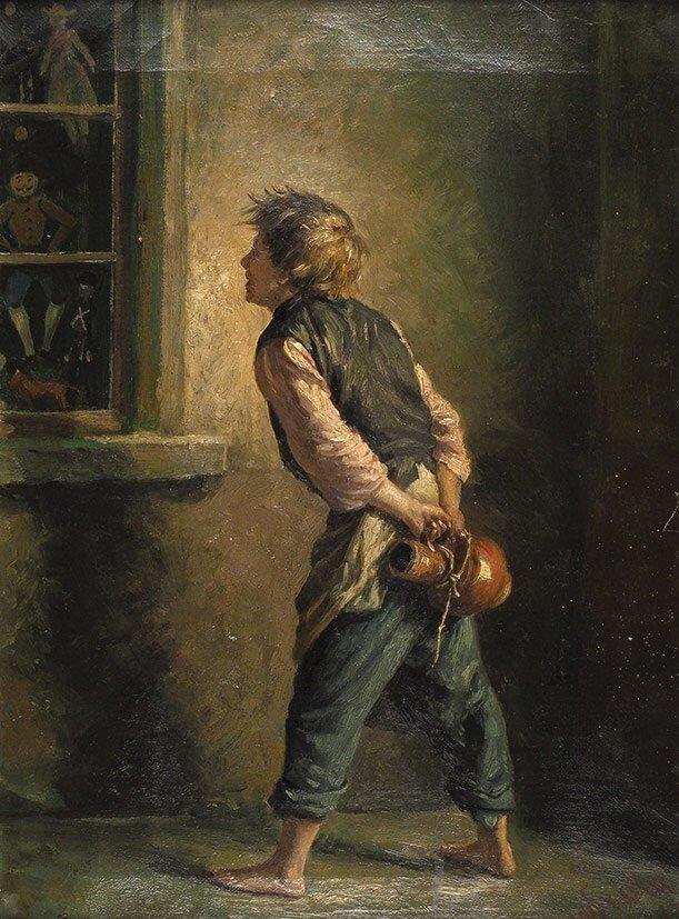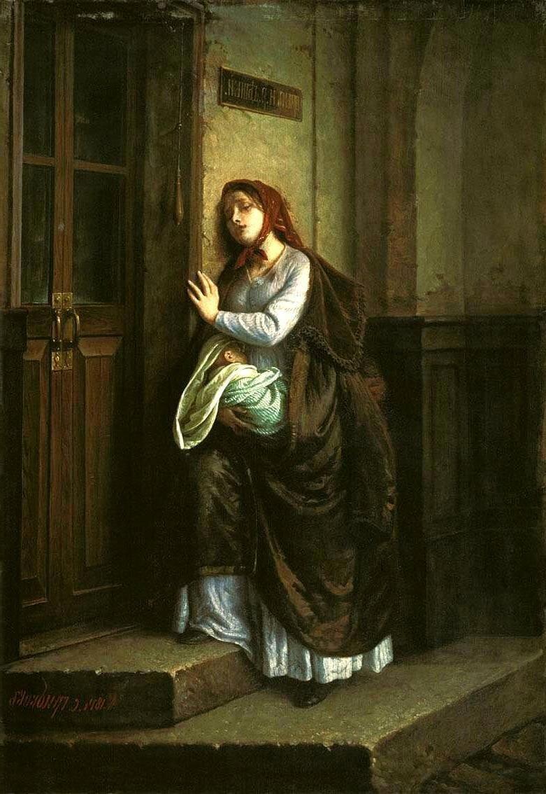 Что тут происходит, легко понять из названия. Просто добавлю всего несколько штрихов. Молодая женщина стоит на пороге мрачного здания, можно рассмотреть надпись «Приём н.р.детей». «Н. Р» - сокращение незаконно рождённых, то есть внебрачных. На женщине простое платье, поверх него похоже что салоп. В начале века это была модная одежда состоятельных женщин, ко второй половине в ней ходили мещанки, небогатые горожанки. На голове героини картины платок, они были популярны в основном у выходцев из крестьянской среды. То есть перед нами с большой долей вероятности девушка родом из деревни, работающая в городе. Здесь у неё случилась внебрачная связь. По легкомыслию, наивности, а иногда и принуждения со стороны работодателя, вариантов может быть много. Теперь нерадивому отцу судьба соблазненной им девушки не интересна, иначе вряд ли бы она осталась в столь бедственном положении. С работы вышвырнули, на новую с незаконно рождённые ребёнком не устроиться, а домой возвращаться стыдно, и не факт, что примут. Приюты для таких детей стали открываться в России в 18 веке. Они появились во многих городах, к 20 веку их было уже около тысячи. Условия в них были разные. В некоторых случаях детей сразу начинали воспитывать в приюте, в некоторых маленьких детей отдавали сначала в деревню под надзор семей, с которыми была соответствующая договорённость, а потом забирали назад для уже дальнейшего воспитания. Детская смертность в приютах была очень высока, до взрослых лет доживали по разным оценкам 10-15%.