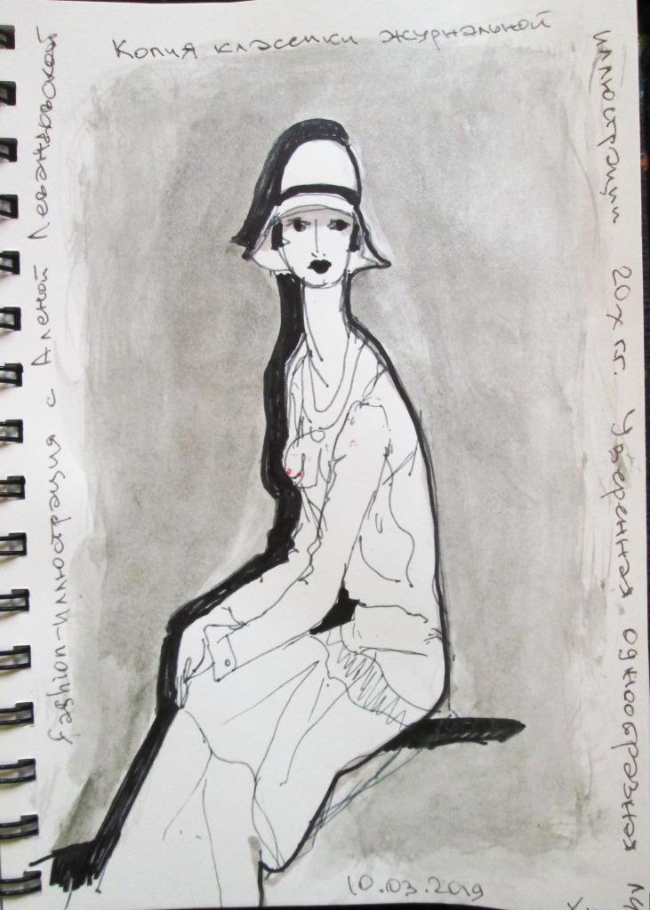 Ещё один очень интересный приём мы постигали через копирование классической журнальной иллюстрации 20-х г.г. Здесь также важна игра линий. Нужно было рисовать не отрывая руки, чтобы линии были плавными. вначале всё рисуется тонким серым линером. Затем черным чуть более толстым обводится внешняя линия. Тень рисуется тем же маркером и зарисовывается внутри.