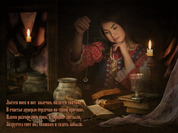 Крещенский Сочельник - последний вечер святочных гаданий, его считают самым правдивыми. После Крещения «пытать судьбу» запрещается. Этот удивительный день во все времена с особым нетерпением ждали чтобы погадать на свою судьбу, на жениха, узнать будущее. Также в Крещенский Сочельник многие любят проводить различные заговоры и ритуалы, с помощью которых хотят улучшить свою жизнь или исполнить заветное желание. Хотя православная церковь и относится к таким "шалостям" не слишком одобрительно, однако святочные гадания считаются старинной русской традицией, которая сохранилась со времен язычества и до наших дней. Вторую неделю святок называли страшной. Считалось, что в это время нечисть догуливала свои последние дни на земле. Смелые могут погадать, если еще не успели. Почему смелые? Да потому что неизвестно, кто именно ответит вам. К гаданиям надо подходить со всей серьезностью, над шутниками нечисть может очень зло *подшутить*.