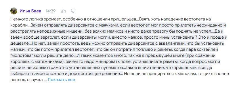 Автор: Руслан БирюшевОтзыв к аудиоверсии "Последней осени". Я помню, вопрос насчёт минных полей этот человек даже задавал мне лично в комментариях ко второму тому - не аудиоверсии, оригиналу. И я тогда подробно объяснил ему, почему "парочка бофорсов" там была бы не к месту, и почему именно минные поля (в частности потому, что списать подрыв мины на применение магии проще, чем обстрел из пулемётов, потому что оперативники попаданцев не должны были вступать в прямой контакт с местными, и потому, что уничтожать королевскую армию в планы пришельцев вообще не входило, только вызвать хаос, чтобы убить королеву - и всё это сказано в самой книге). И вот, он комментирует третий том... и снова вспоминает тот же вопрос. Мораль? Авторы - не утруждайтесь.