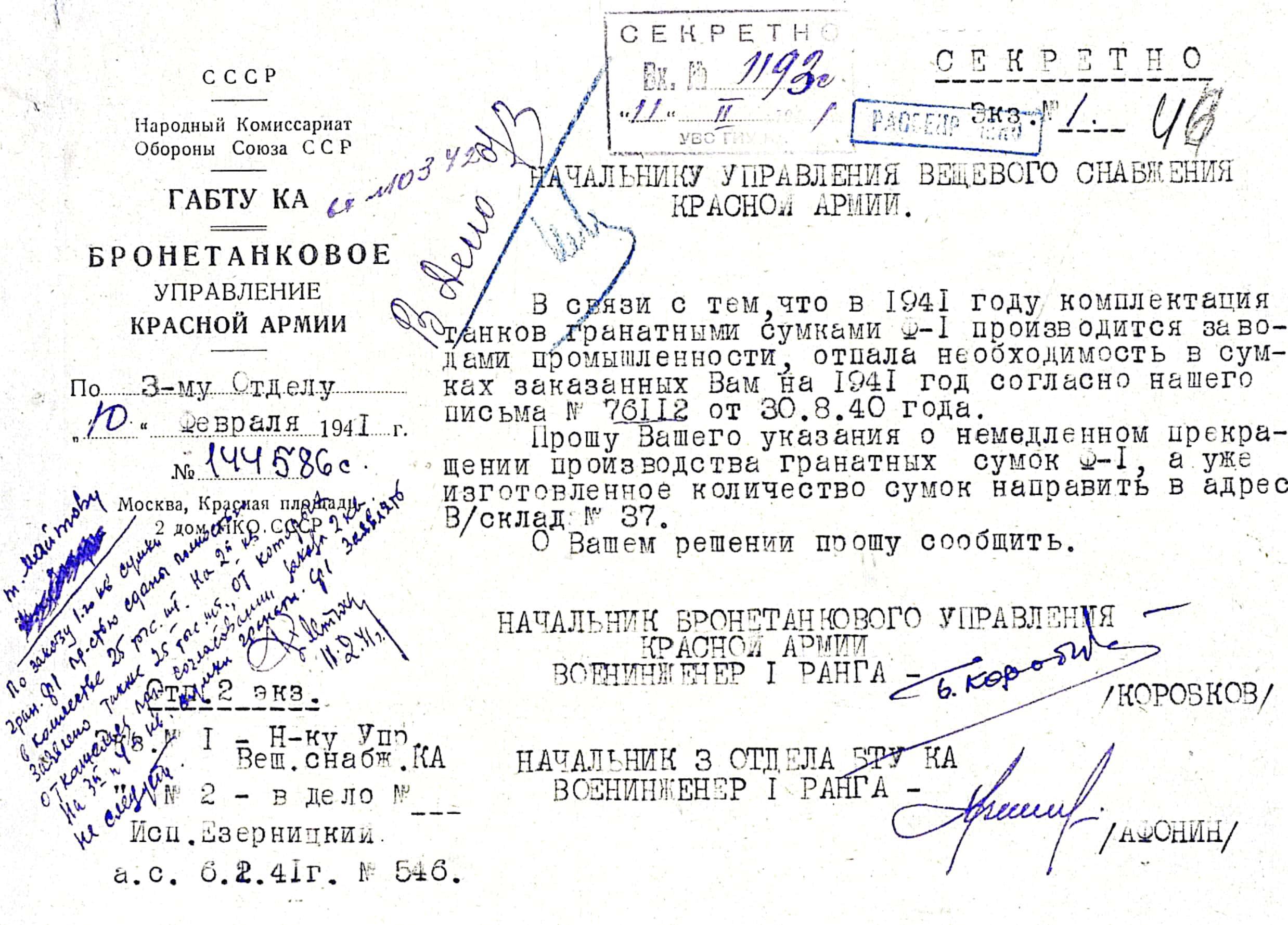 Запутанная история и с сумками для ручных гранат. Уже с начала 1941 года, Главное автобронетанковое управление решило вопрос, чтобы танки комплектовались гранатными сумками ещё на этапе изготовления. Но, управление вещевого снабжения об этом узнала только в феврале, сделав заказ и выделив деньги на имущество, потребность в котром у ГАБТУ уже почти пропала.