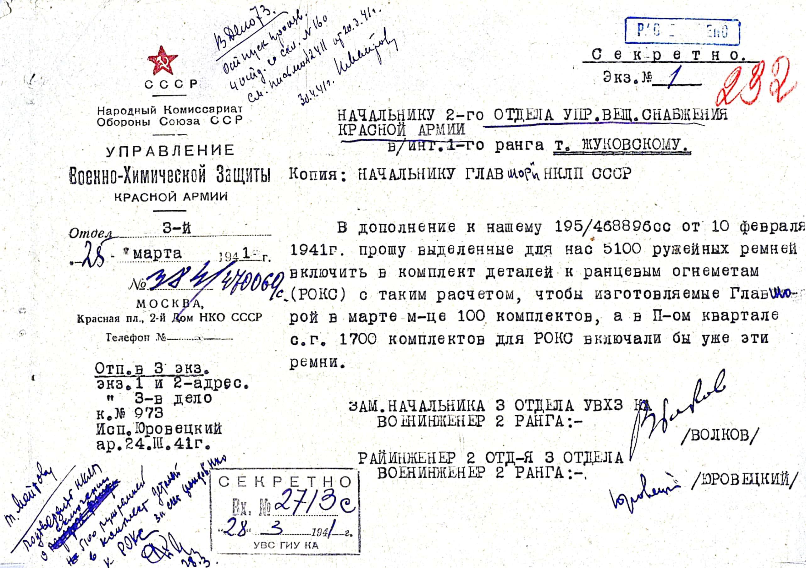 Как ни странно, ружейные ремни для РОКСов заказывала вещевая служба, а управлению Военно-Химической Защиты Красной Армии приходилось отправлять в вещевую службу отдельную заявку на, по большому счету, своё же имущество.