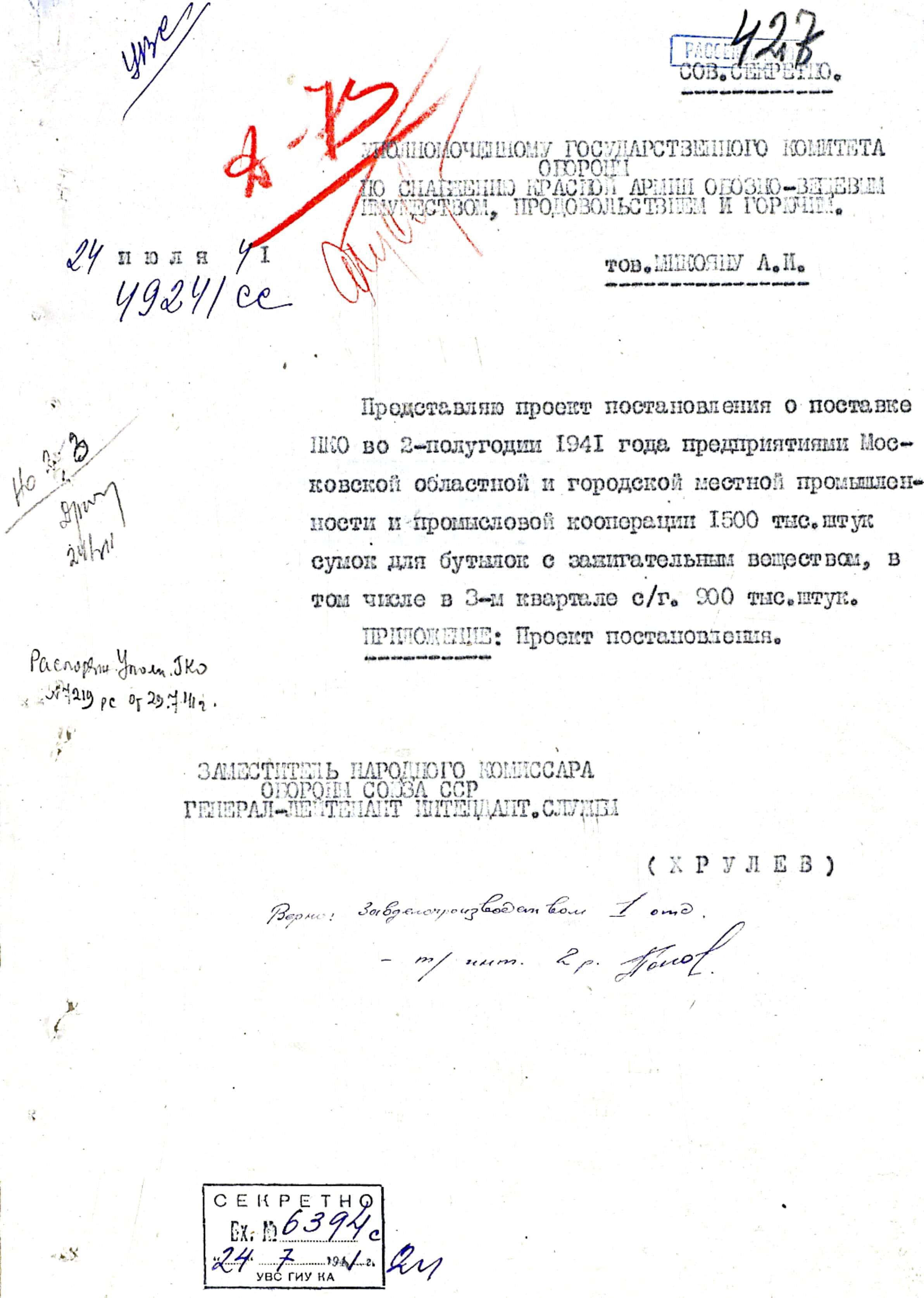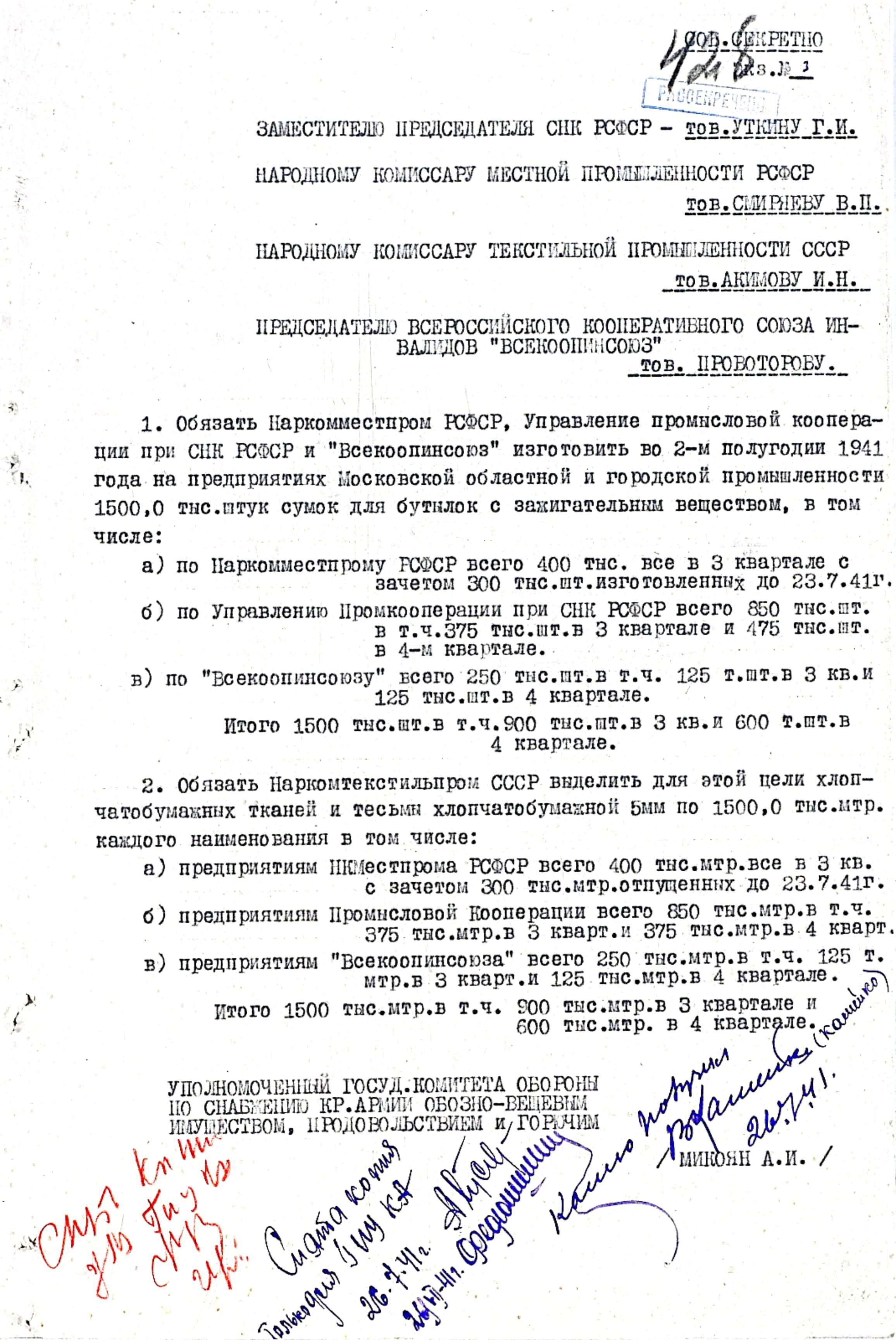 Тем не менее, промышленность поставляла специализированное снаряжение. Так, согласно постановлению ГКО, только на второе полугодие и только предприятиями Московской областной и городской промышленности должно было быть изготовлено полтора миллиона сумок для бутылок с зажигательной смесью. Цифра немалая, но одним этим заказом полностью закрыть потребность Красной Армии не получилось бы.