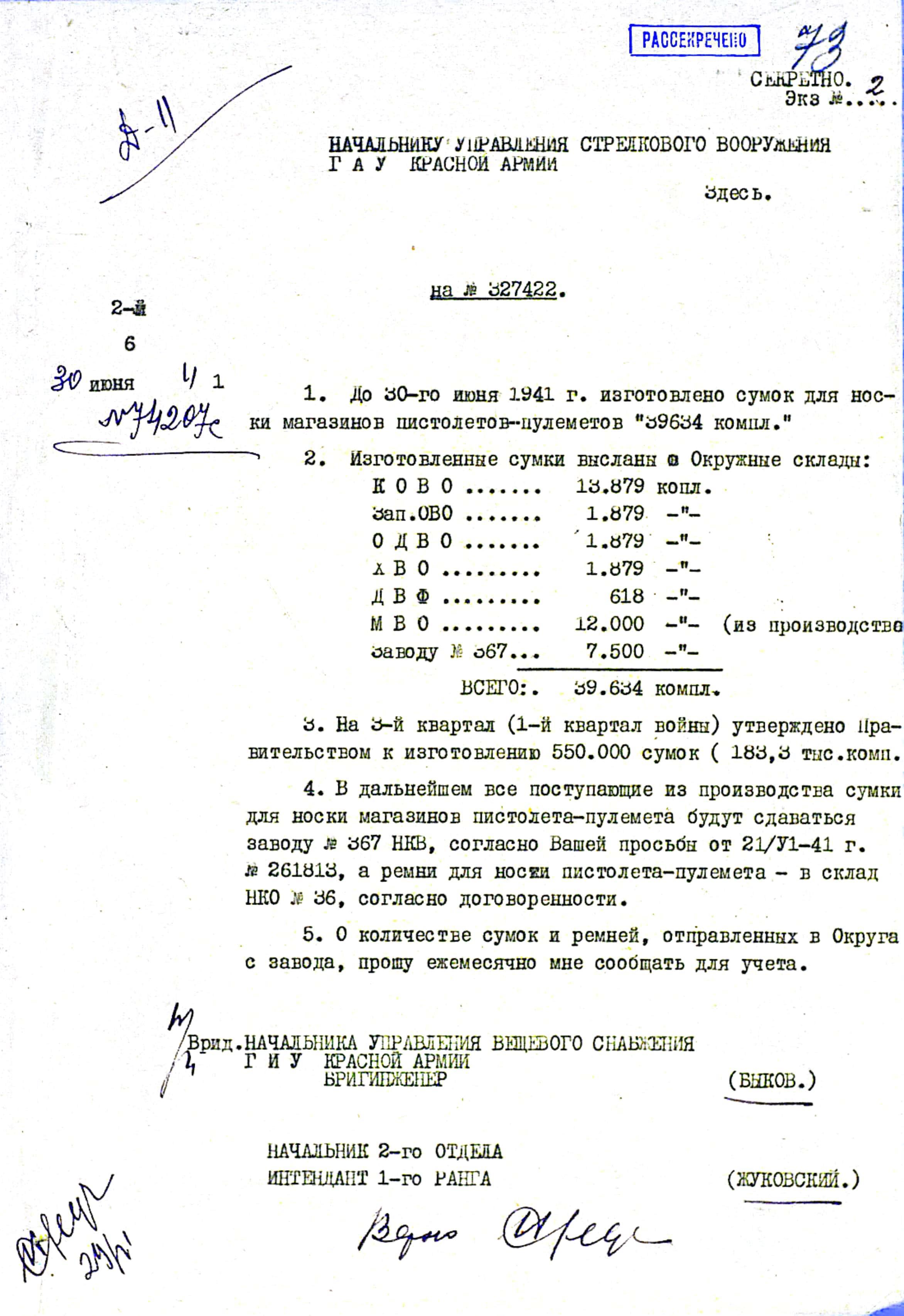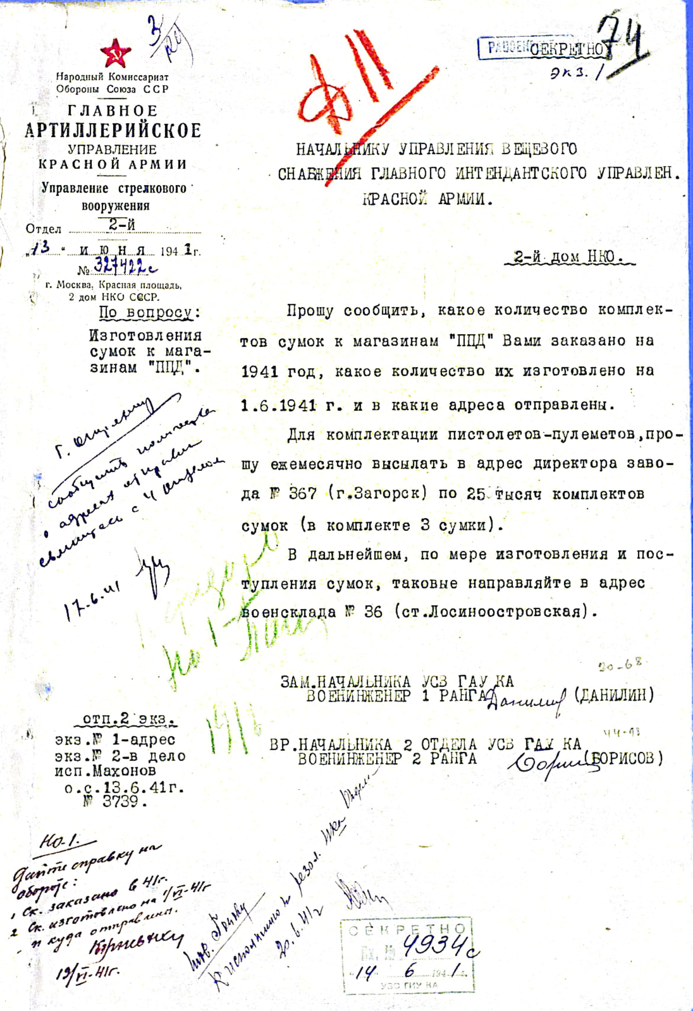 Так вот, судя по заявке Главного Артиллерийского Управления Красной Армии, за десять дней до начала войны, изготовители ППД не знали сколько подсумков заказано, сколько изготовлено и куда отправлено.