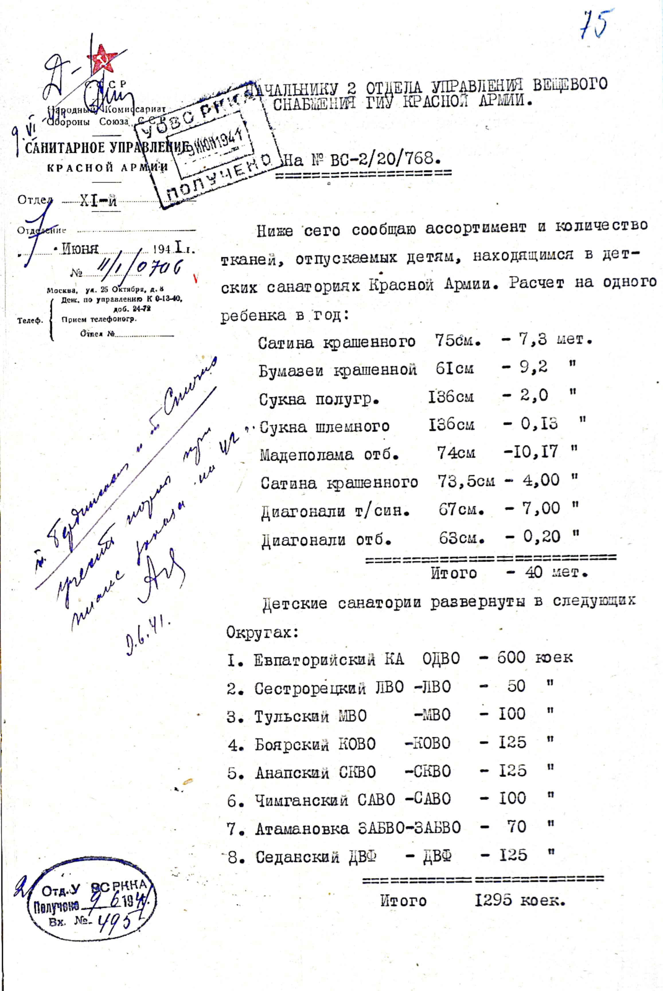 Обычное письмо от одного управления НКО другому, заявка на ткани, расчёт. Летом 1941 года, в восьми детских санаториях Красной Армии в одну смену, должно было отдохнуть почти 1300 детей командного и политического состава Армии. Всего-то. Капля, в море советских детей.