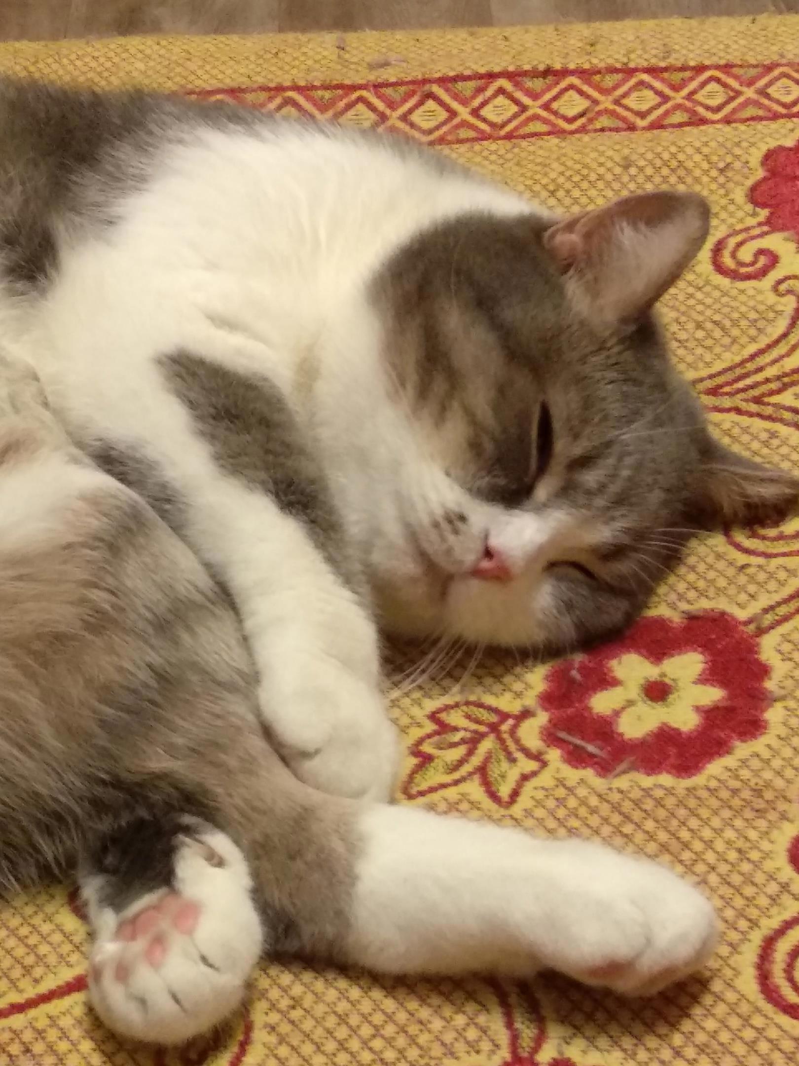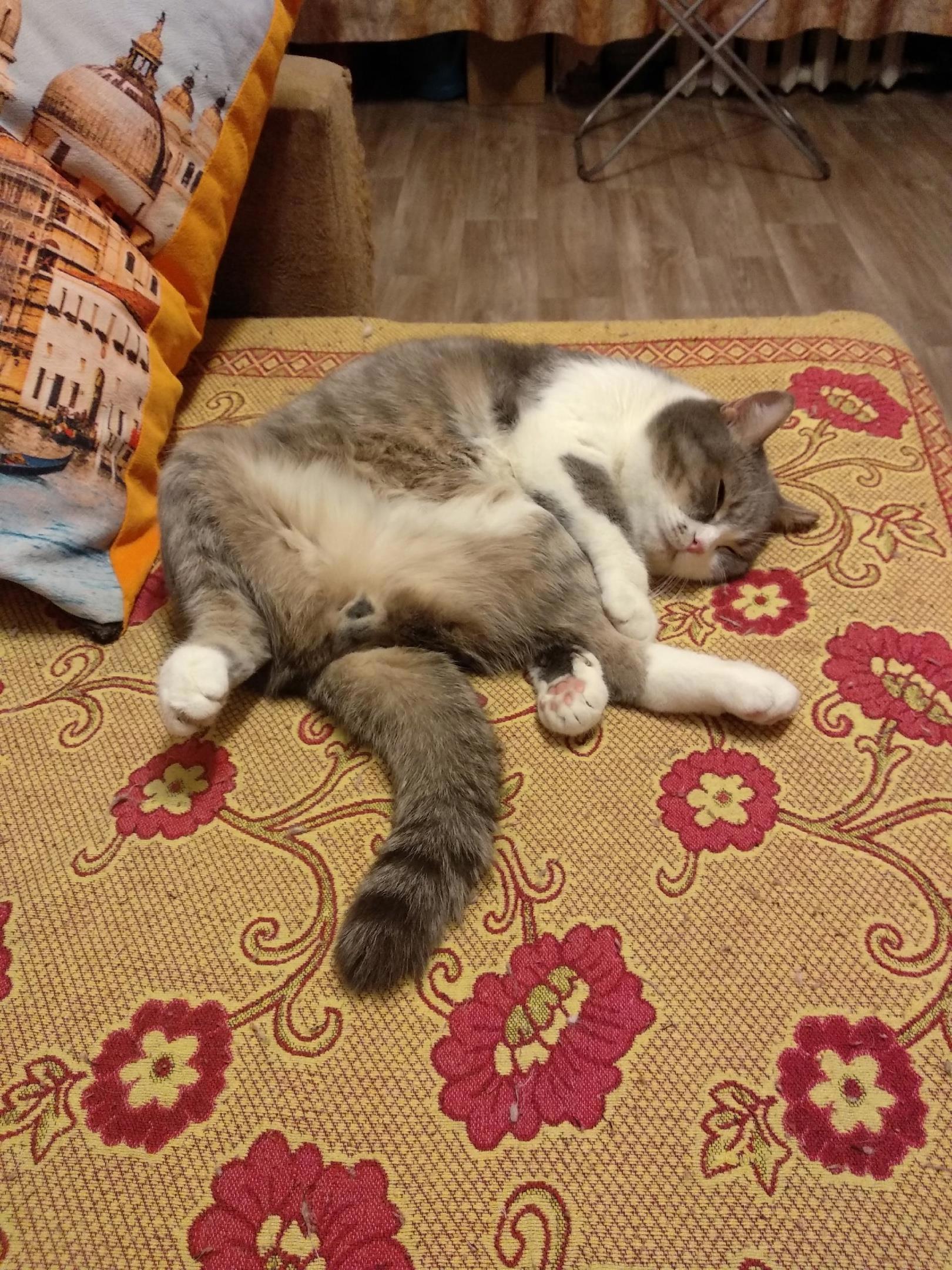 Котик Том как бы намекает всей своей позой, что надо остаться дома и продолжить спать. Спит он самозабвенно, полностью и без остатка отдаваясь процессу. Как истинный гуру релакса.