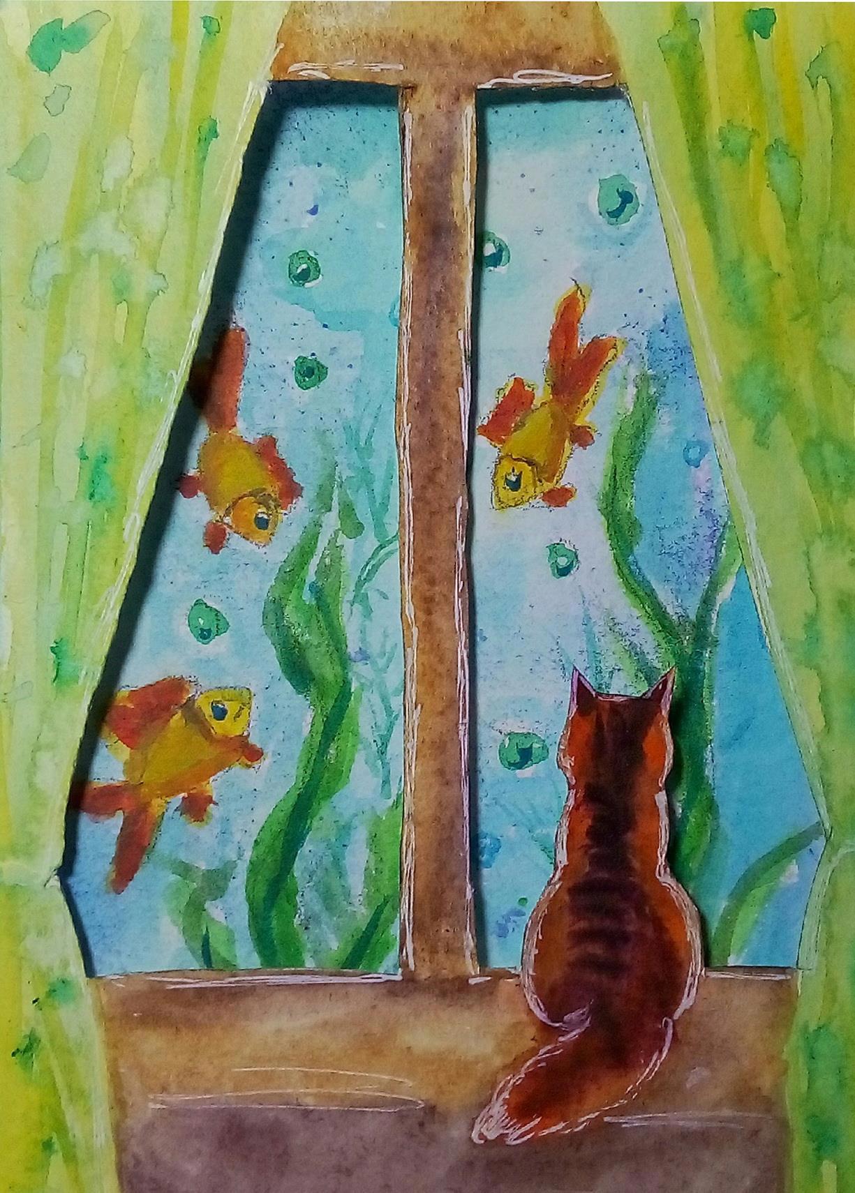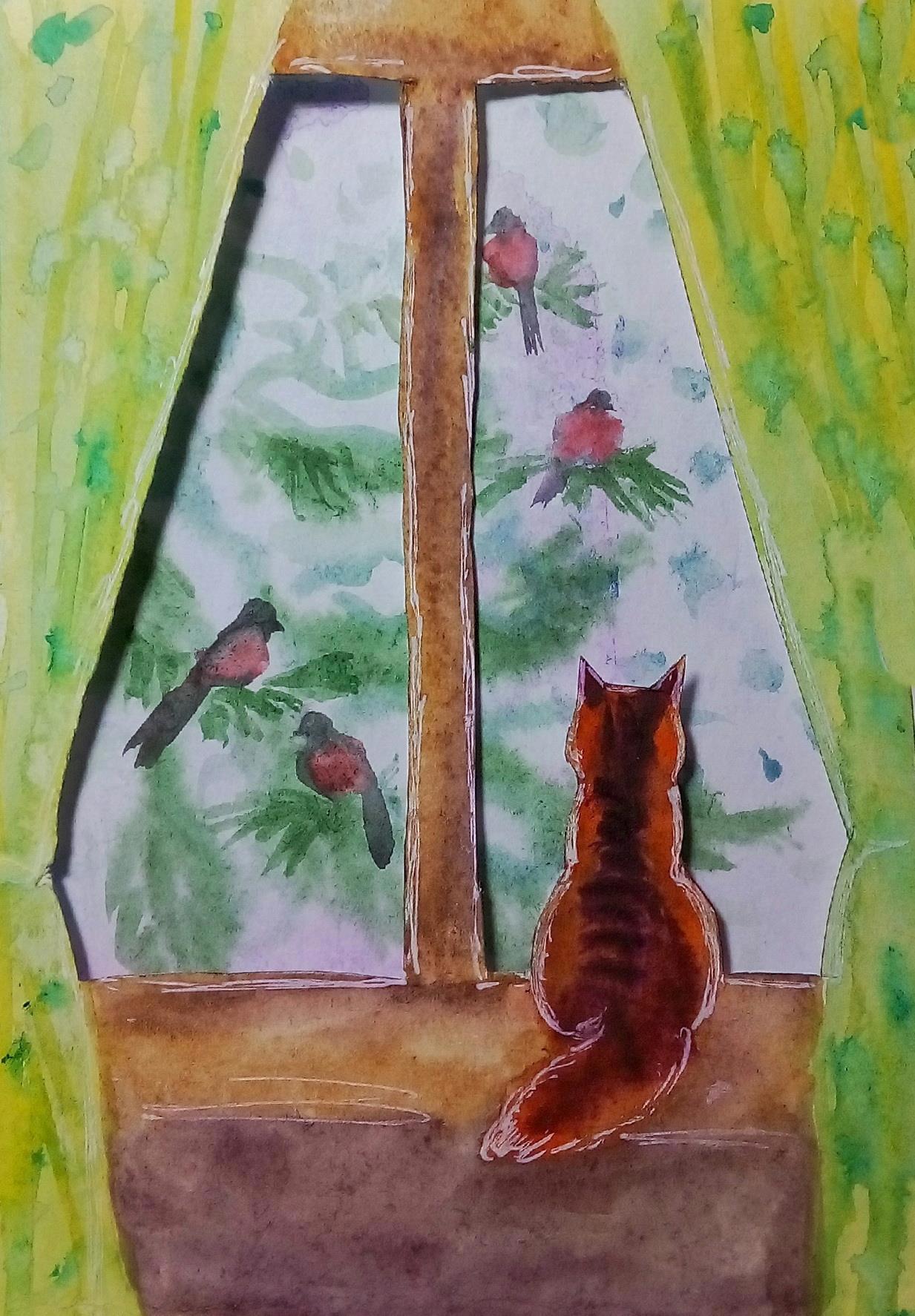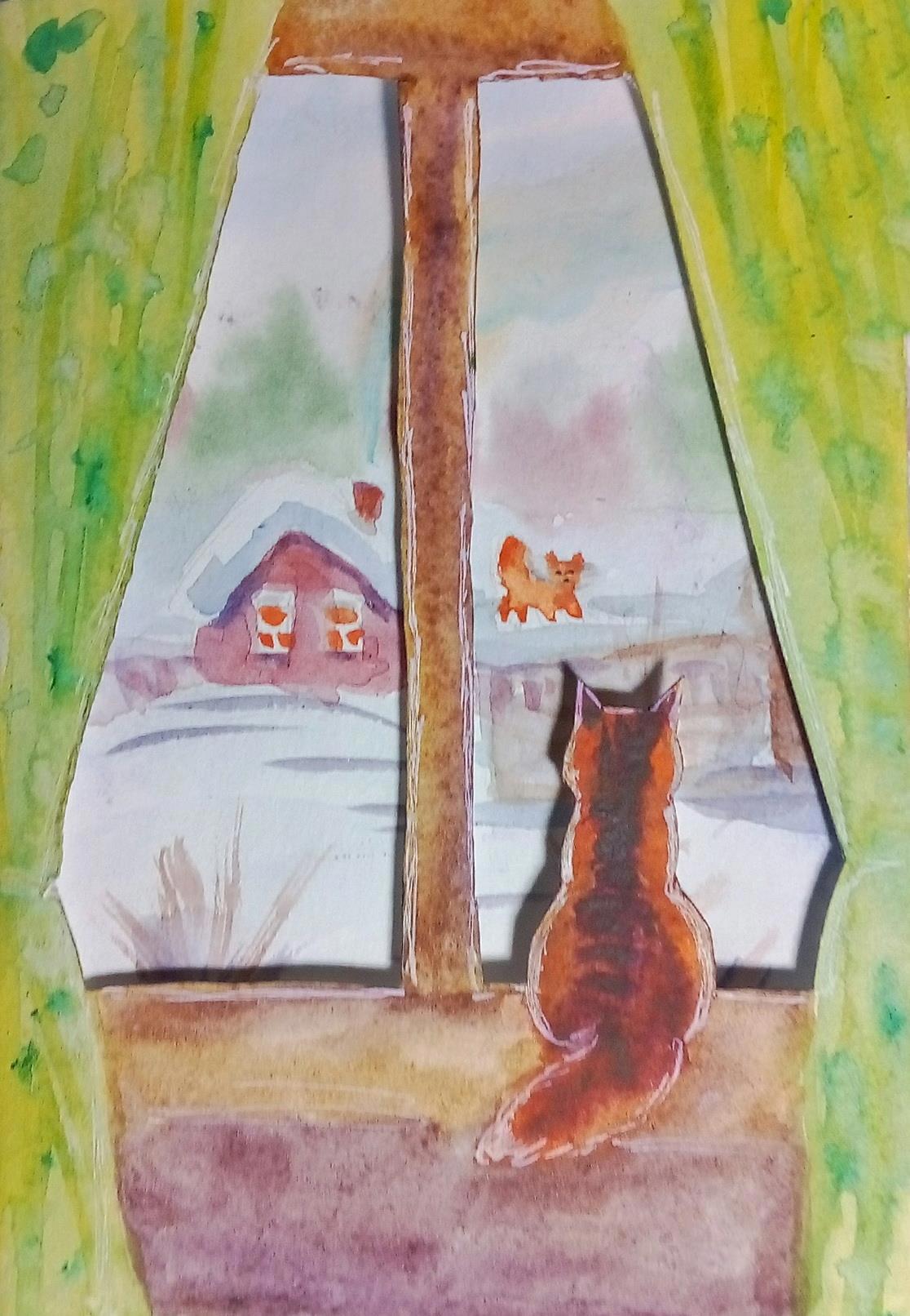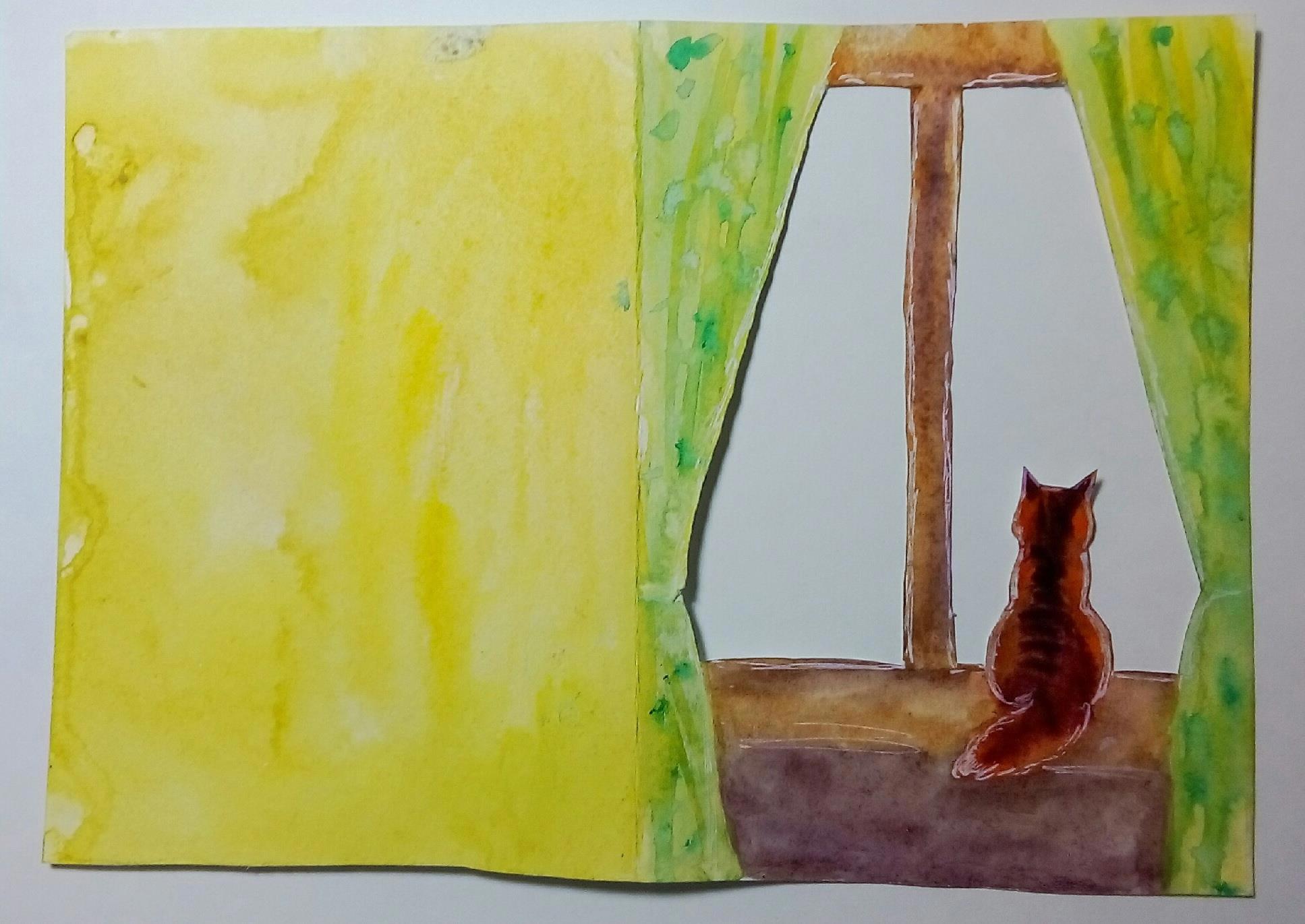 Интересная игра для любителей рисовать. Из половинки альбомного листа сделать открытку, где кошка сидит на окне, вырезав "стёкла".