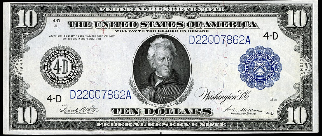 В 1914 году Эндрю Джексон появился на десятидолларовой банкноте.