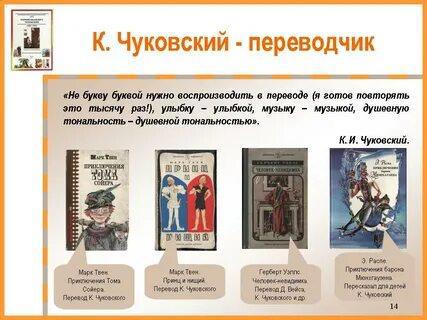 В Англии Чуковский с позором обнаружил, что его старания не дали никаких результатов. Он ни слова не понимал по-английски, а его «английская» речь была непонятна для носителей языка. Позже он, конечно, выучил его в совершенстве. Переводил не только свои собственные книги, но и книги других англоязычных авторов. За свою жизнь Чуковский перевел на русский язык множество романов. Именно благодаря его кропотливому труду в России были опубликованы переводы Даниэля Дефо, Гилберта Честертона и многих других писателей. (kulturologia-ru)