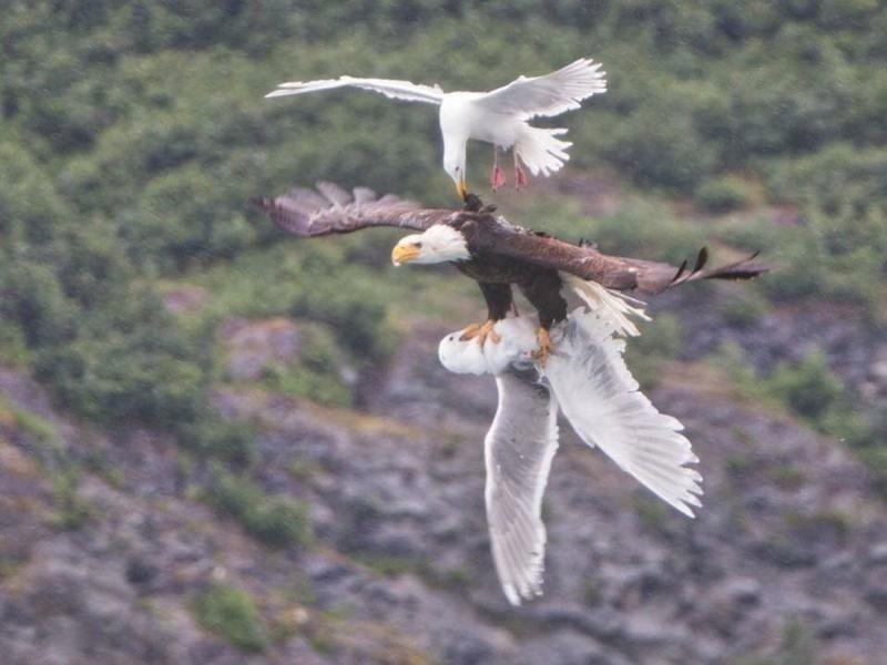 На этой трогательной фотографии изображена чайка, пытающаяся помочь другой чайке, которую, к несчастью, атаковал белоголовый орел. Белоголовые орланы известны как высшие хищники в дикой природе. Они охотятся на мелких или средних животных, включая птиц. К сожалению, чаек часто включают в их меню.