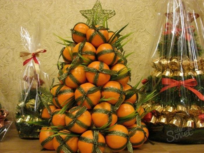 Можно купить живое мандариновое деревце и украсить его сладостями и конвертиками. Но тут главная фишка, чтоб число мандаринок на нем было кратно 8, потому что 8 - число долголетия и здоровья.