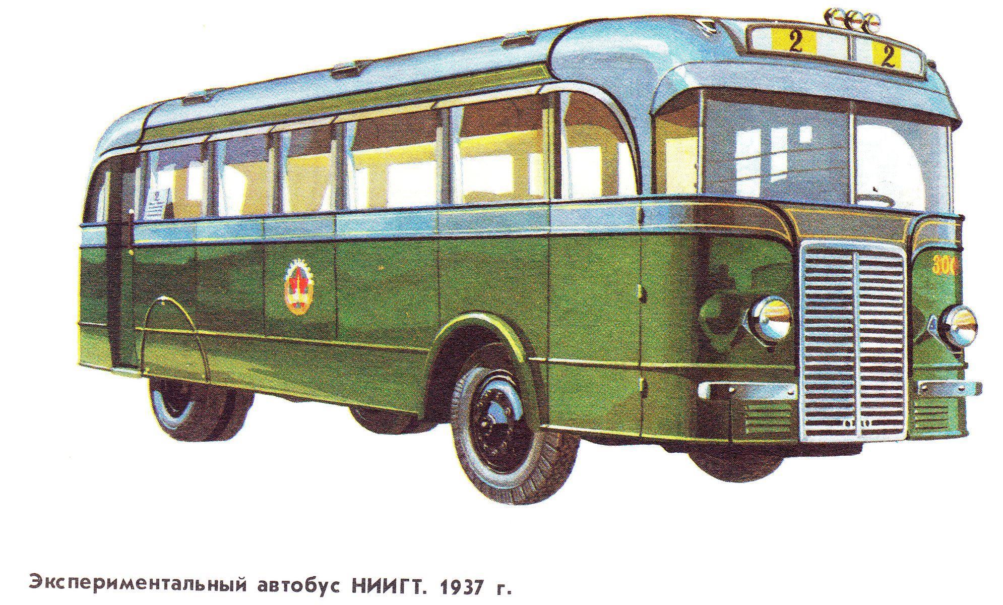 В числе первых машин этой компоновочной схемы надо назвать конструкции НИИГТ, НАТИ и ЗИСа. Научно-исследовательский институт городского транспорта (НИИГТ) Моссовета в 1936 году спроектировал автобус (разработчики — специалисты НАТИ Б.М. Фиттерман, А.А. Душкевич, Б.В. Гольд, А.Е. Оксентьевич, Ю.А. Долматовский). В нем использовались двигатель, коробка передач, задний мост, удлиненная рама, тормоза от серийного автобуса ЗИС-8, а также передний мост, рулевое управление, вакуумный усилитель в приводе тормозов от грузовика ЯГ-4. Вынесенный сильно вперед двигатель был смещен вправо, рядом с ним располагался водитель (как на хорошо известном ЛиАЗ-677). Сам кузов с деревянным каркасом и стальной обшивкой получился весьма вместительным — в нем удалось расположить 32 сиденья для пассажиров против 21 у автобуса ЗИС-8. Поскольку у машины, подобно троллейбусу ЛК-1, был большой передний свес, да и двигатель размещался впереди передних колес, то их пришлось оснастить шинами увеличенного размера (36X8″, против 34X7″ задних). Кузов автобуса НИИГТ в 1937 году изготовил СВАРЗ, а сборку вел 2-й автобусный парк Москвы. Машина находилась в опытной эксплуатации на одном из маршрутов столицы и серийно не изготовлялась. Ее габарит: длина — 8950 мм, ширина — 2200 мм, высота — 2760 мм, база — 4420 мм. Масса автобуса в снаряженном состоянии 4800 кг. При 73-сильном двигателе ЗИС-5 скорость автобуса НИИГТ составляла 48 км/ч.
