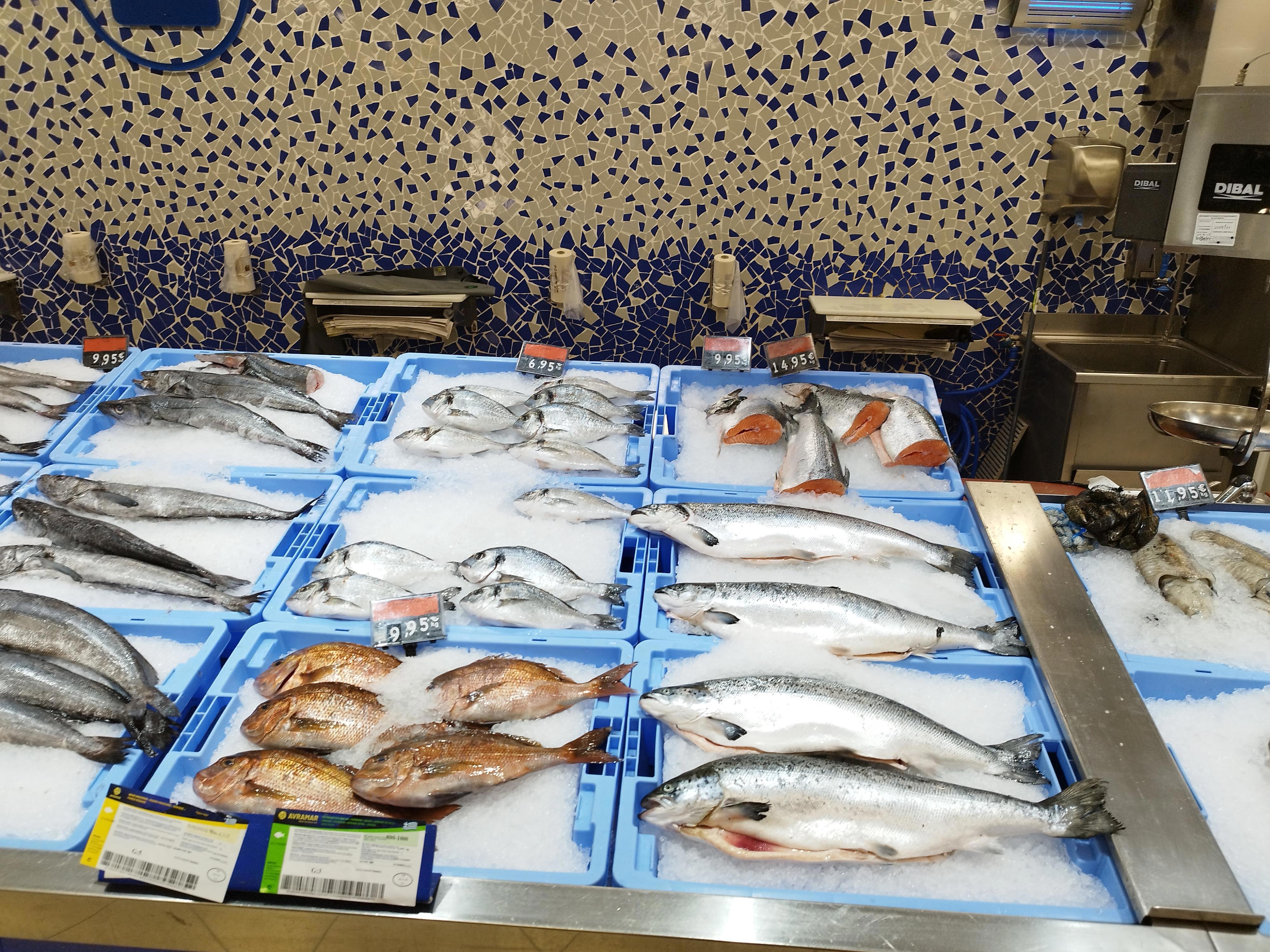Кароч, взяли бухлишка, соков, мужу - пива, я нашла здесь нормальную кукурузную муку - которой мне так не хватало во Франции. Из рыб купили крайнюю справа, самую нижнюю. Прилечу - буду требовать рыбный суп. Из семи рыбьих, эээээ, голов. Пять покрошены - две так положены, да.