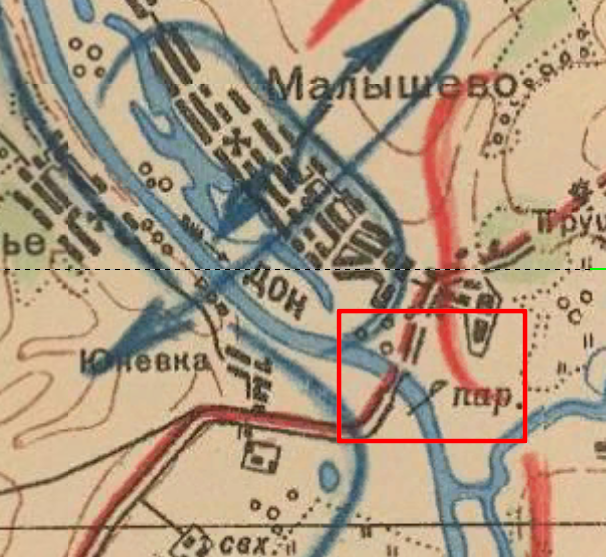 Одной из важнейших переправ через Дон была находившаяся к юго-западу от Воронежа в районе села Малышево — прочный автодорожный мост, способный выдержать вес танков. Данный участок входил в полосу обороны 498-го сп 232-й сд. Цитата из журнала боевых действий дивизии:
