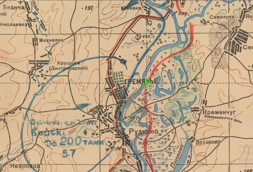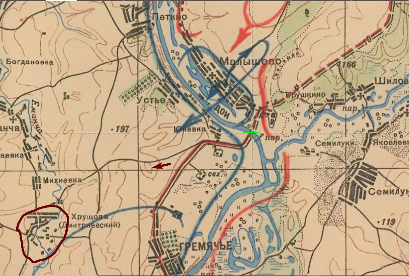 Деревню Дмитриевку обвёл кружком, высота 147.2 с координатами (51.517075; 39.009361) на карте обозначена только рельефом и стрелкой, ну и зелёный крестик на мосту через Дон.