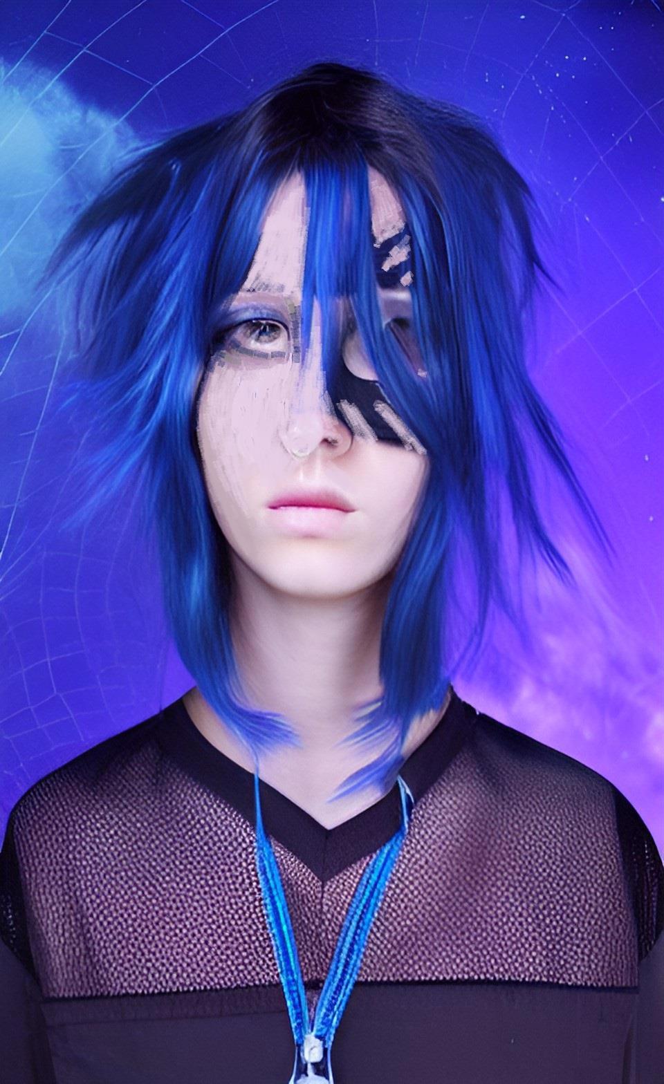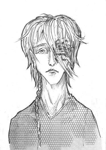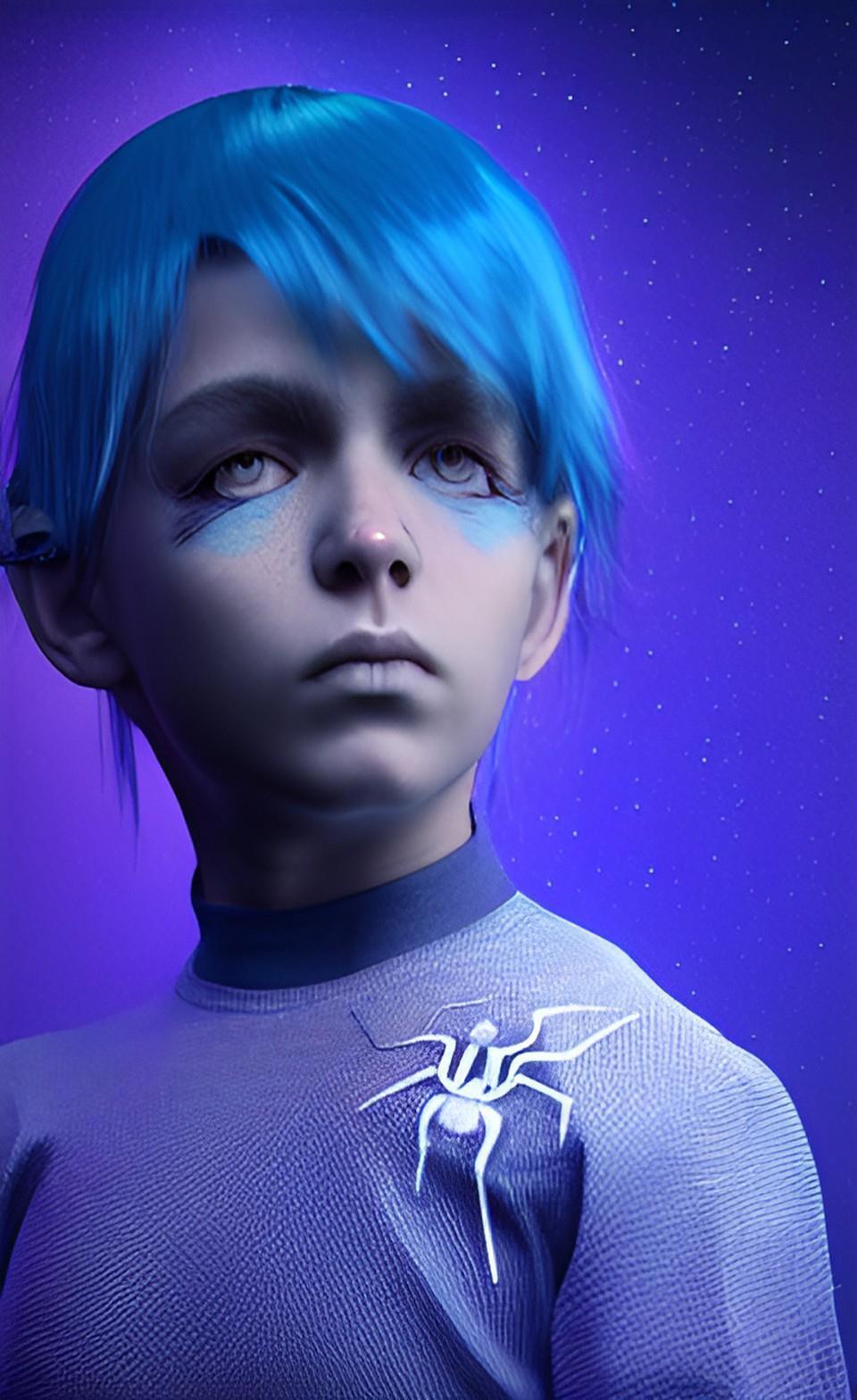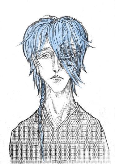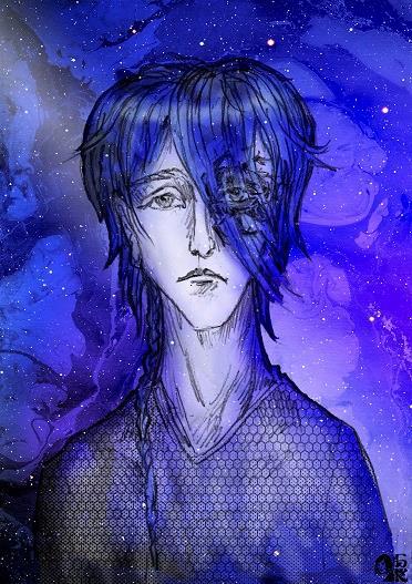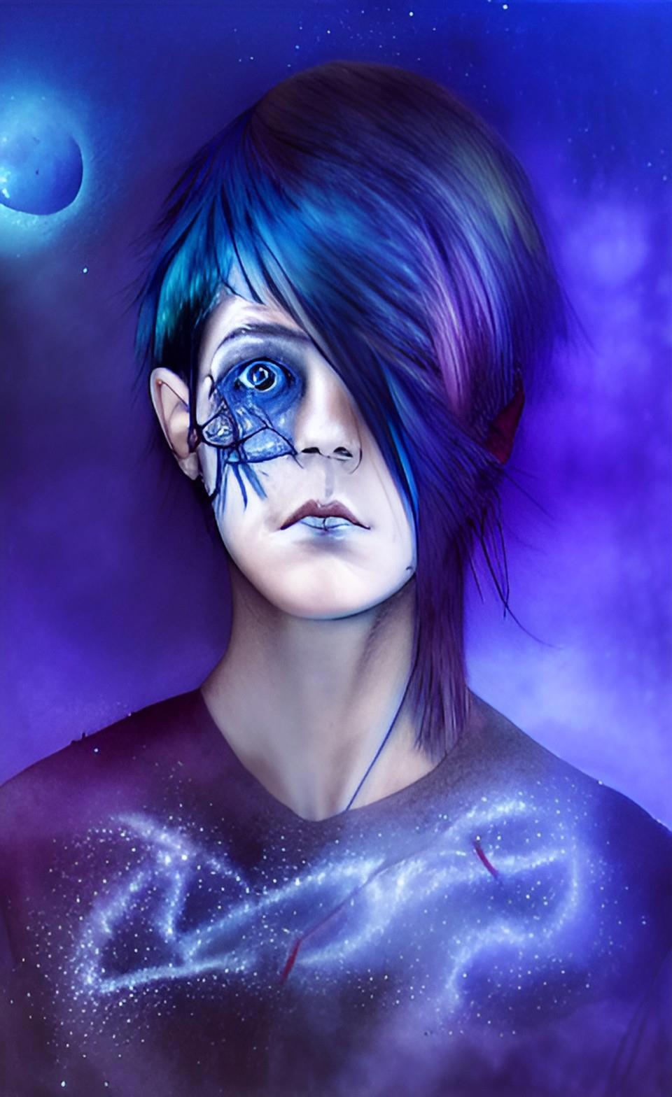 Он молод, лет двадцать. Очень худой. Белая кожа, серые глаза. Вокруг одного глаза сделана татуировка в виде паука с лапками - получил тату когда был в рабстве у космических пиратов. Волосы голубого цвета, средней длины, пушистые, на затылке переходящие в тоненькую длинную косицу - особенности культуры его планеты. Длинная чёлка свисает на одну сторону лица - попытка скрыть татуировку. Какой-то условный комбинезон, как одежда для космического корабля.