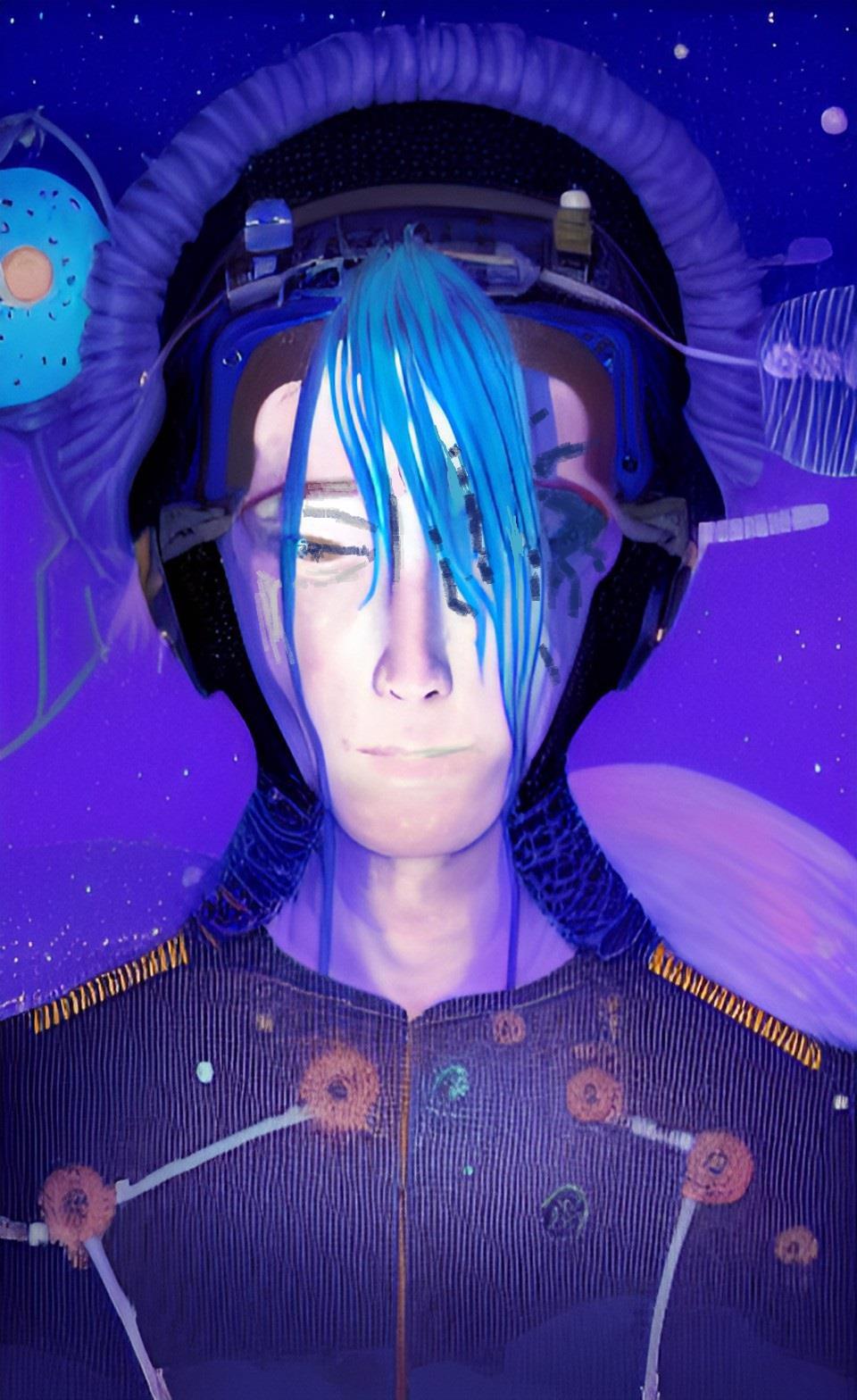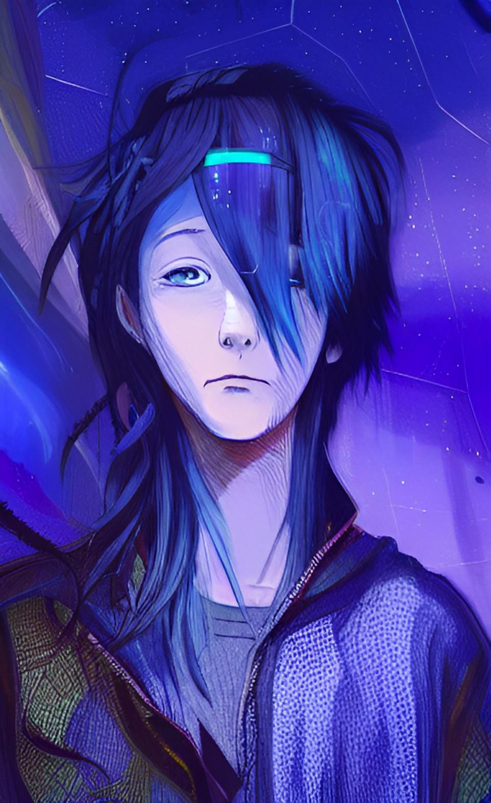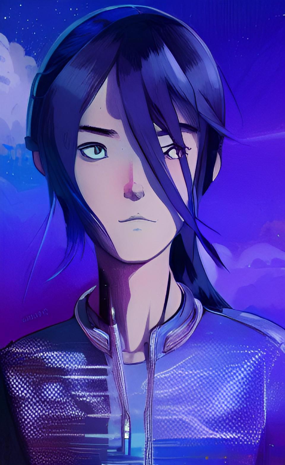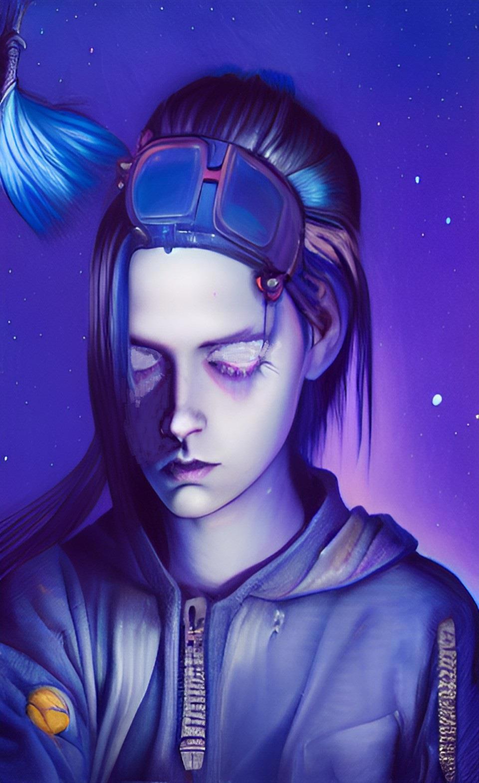 Он молод, лет двадцать. Очень худой. Белая кожа, серые глаза. Вокруг одного глаза сделана татуировка в виде паука с лапками - получил тату когда был в рабстве у космических пиратов. Волосы голубого цвета, средней длины, пушистые, на затылке переходящие в тоненькую длинную косицу - особенности культуры его планеты. Длинная чёлка свисает на одну сторону лица - попытка скрыть татуировку. Какой-то условный комбинезон, как одежда для космического корабля.