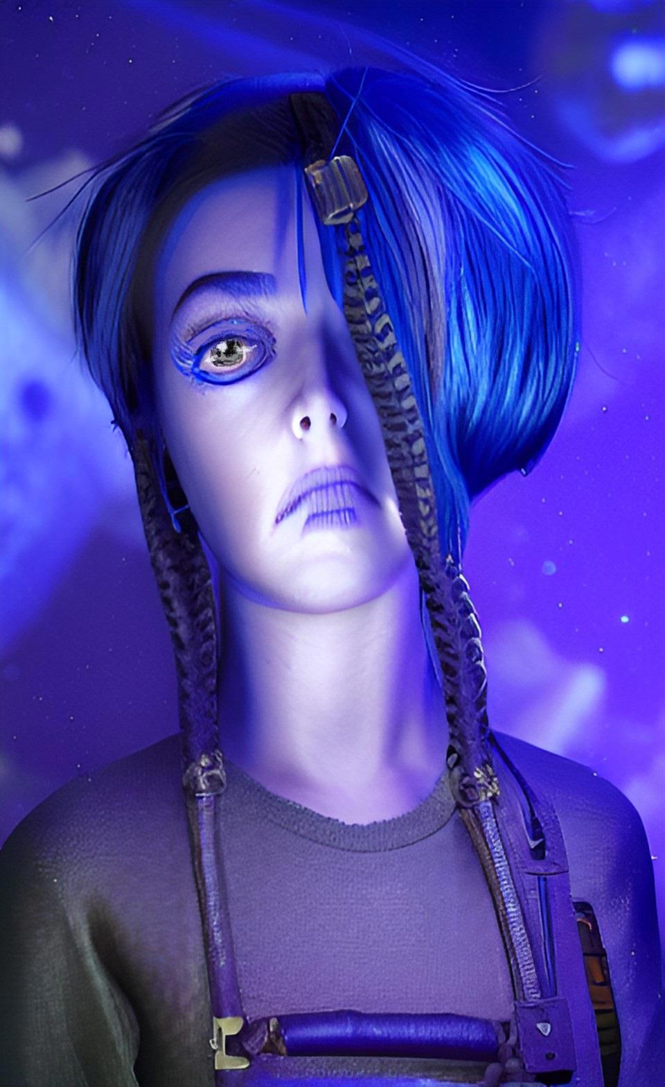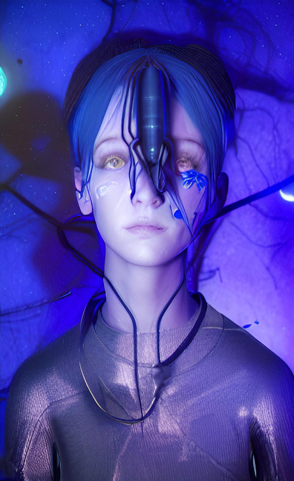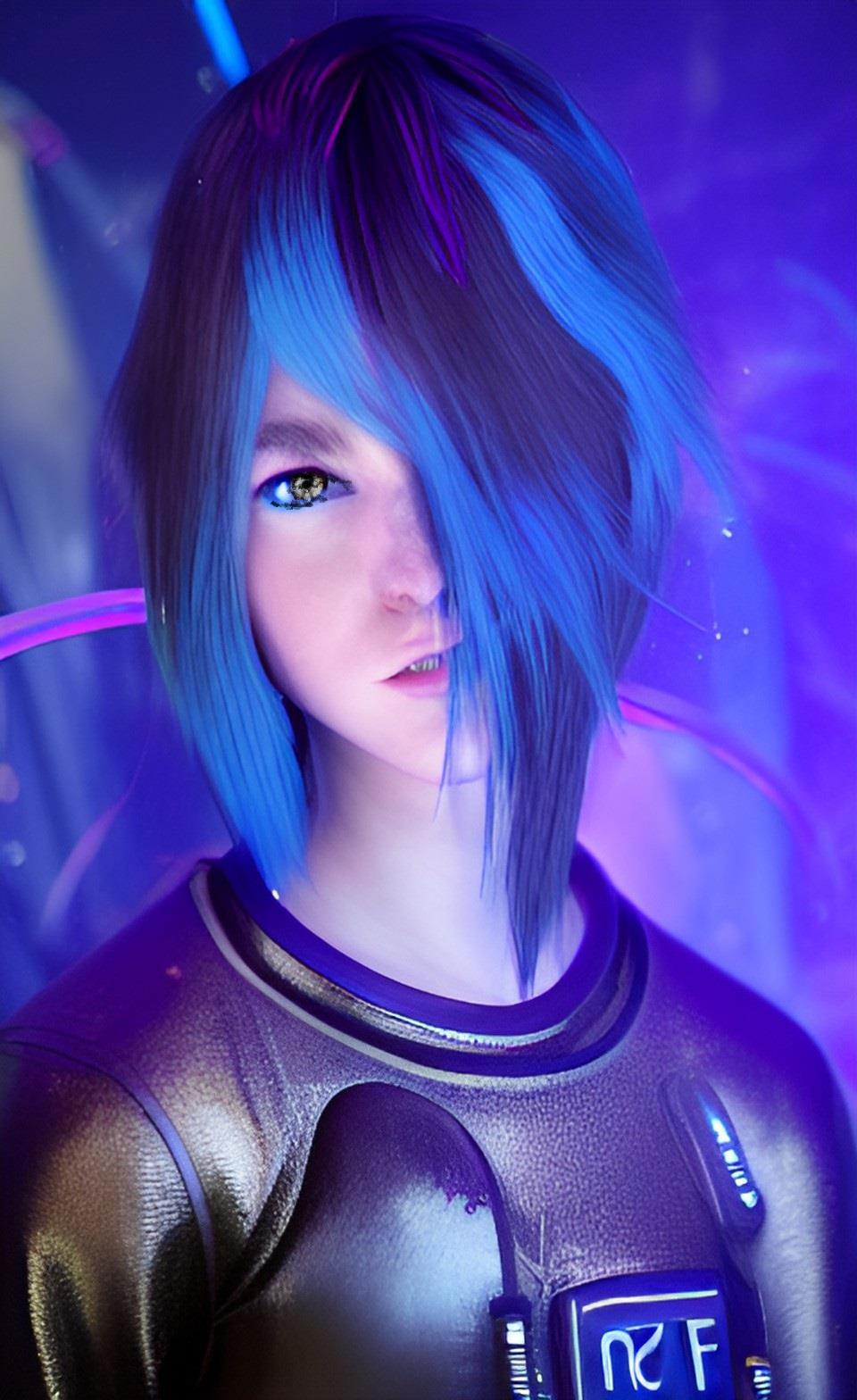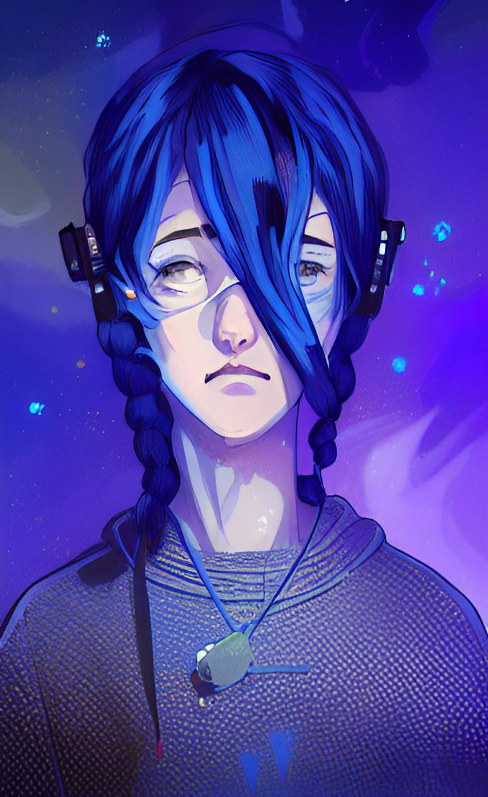 Он молод, лет двадцать. Очень худой. Белая кожа, серые глаза. Вокруг одного глаза сделана татуировка в виде паука с лапками - получил тату когда был в рабстве у космических пиратов. Волосы голубого цвета, средней длины, пушистые, на затылке переходящие в тоненькую длинную косицу - особенности культуры его планеты. Длинная чёлка свисает на одну сторону лица - попытка скрыть татуировку. Какой-то условный комбинезон, как одежда для космического корабля.