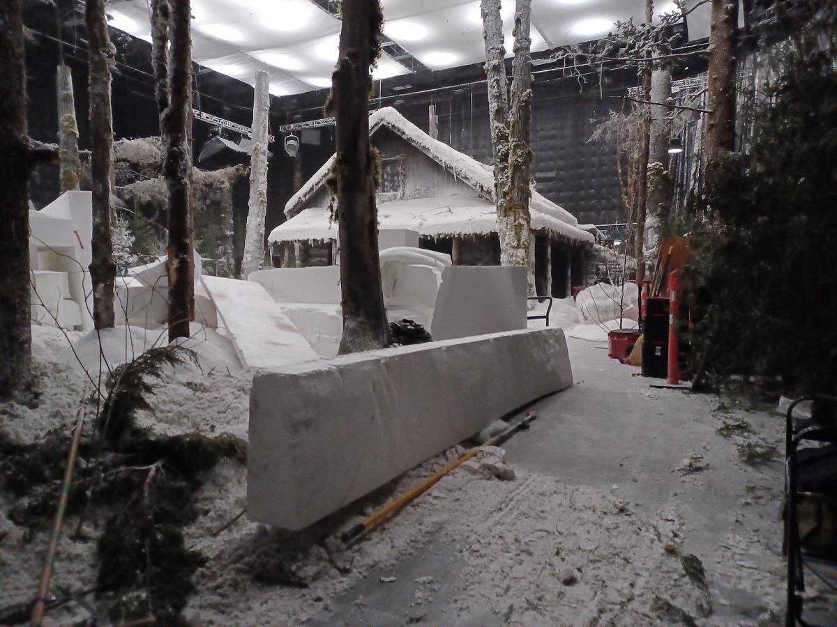 События разворачивались в старой охотничьей хижине, очень пыльной. Я видела мешки с декорациями, подписанные “Пыль” и “Паутина”. Вокруг хижины – лес и снег, деревья настоящие, снег – нет; но выглядело всё натурально.