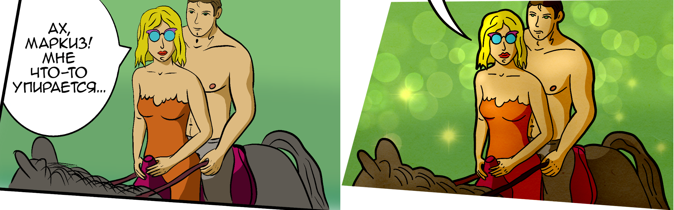 Вот, например, две нижние картинки. Левая - кадр из моего комикса, который я сделал в декабре. Правый - тот же кадр, который я перерисовал сегодня (не с нуля, а удалил старые линии, нашпарил поверху и залил цветами). Вопрос: какая из картинок больше сожрала у меня времени для создания теней и эффектов?