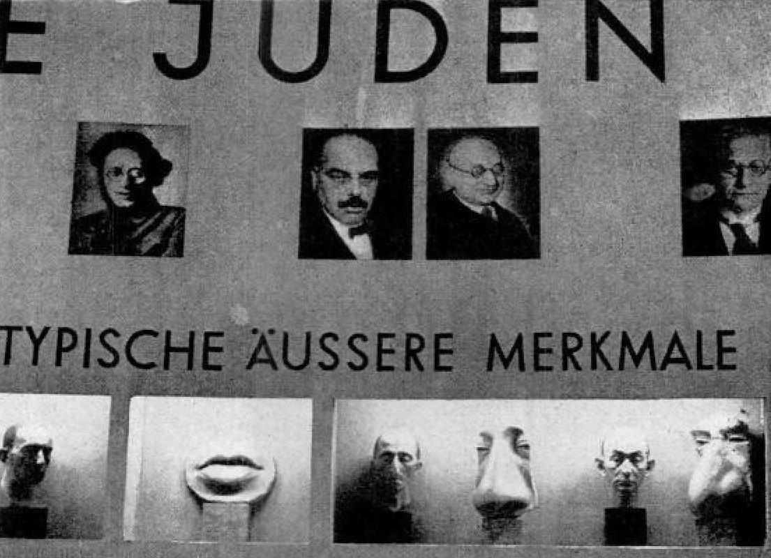 Война с евреями достигла Вены 11 марта с авангардом немецких нацистских воротил. Евреев избивали, оплевывали, изгоняли из их газет, театров, магазинов, и все это в соответствии с нацистским объяснением, что евреи разорили немцев. Вверху - экспонат Мюнхенской антисемитской выставки, демонстрирующий известные еврейские лица, а внизу - гипсовые модели “еврейских” черт: губ, носа.