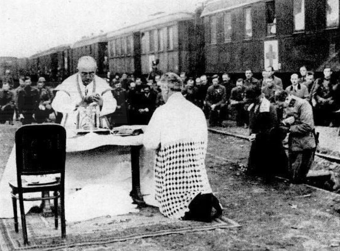 Последний император Карл I, сменивший своего двоюродного дедушку Франца-Иосифа в 1916 году, объединил Австрию в 1918 году после перемирия. Выше, со своей женой Зитой, он останавливается на венгерской железнодорожной станции, чтобы помолиться за Австрию и за себя. Его отречение не было предусмотрено мирными договорами.