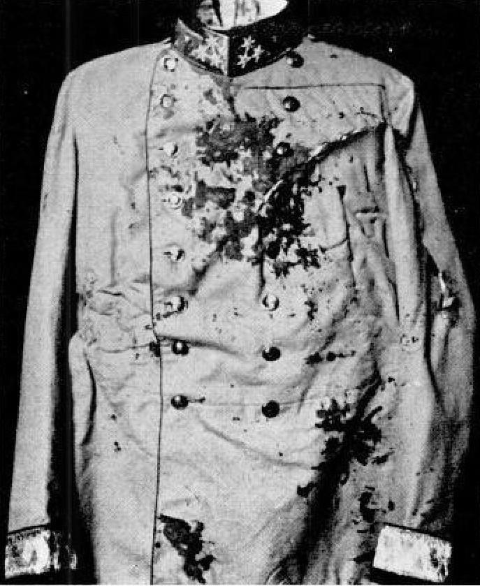 Час спустя его мундир выглядел вот так. Сербская бомба отправила эрцгерцога и его жену на тот свет. Австрия направила Сербии ультиматум, и началась Мировая война.