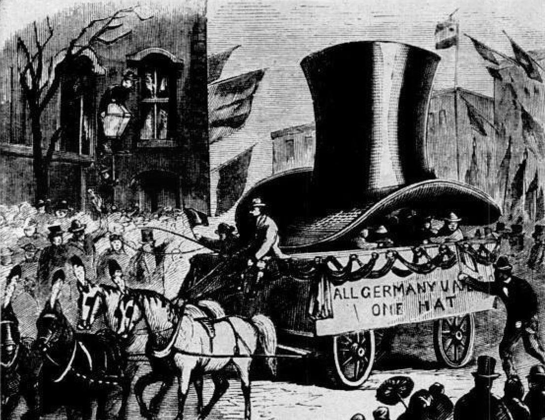 "Вся Германия под одной шляпой" - таков был лозунг, придуманный немцами в Нью-Йорке, четвертом немецком городе в мире, в апреле 1871 года после триумфа Бисмарка. Редакторы газет отметили, что парад был неамериканским, потому что все 60 000 участников марша шли в ногу.
