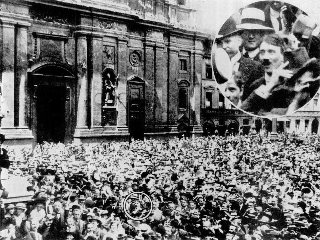Когда Германия вступила в войну, молодой Адольф Гитлер стоял на переполненной площади Мюнхена 2 августа 1914 года и дико аплодировал (см. увеличенную вставку с его лицом в окружении). Неудачник в искусстве, в том числе в архитектуре, в росписи домов, в продаже открыток в Вене, он недавно приехал в Мюнхен, движимый уже тогда пангерманскими мечтами. Война, пишет он в "Майн Кампф", «...пришла как избавление от неприятных переживаний моей юности. ...В порыве энтузиазма. Я опустился на колени и от всего сердца возблагодарил Небеса».