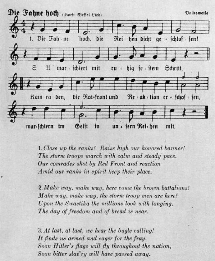 Песня Хорста Весселя - это нацистский гимн. В первую очередь маршевая песня, она официально причисляется к Deutschland Uber Alles. Правильно поется с вытянутой правой рукой.