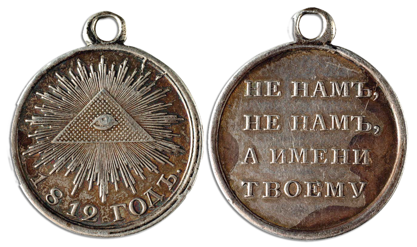 А вот девиз тамплиеров, исчезнувший с монет после смерти Павла, вернулся на официальный российский чекан в 1813 году, но не на монете, а на массовой медали, посвященной войне 1812 года (фото из интернета):