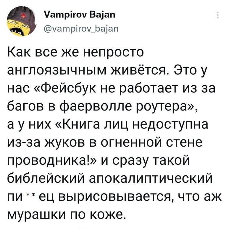 Автор: Виктория ФингерА ведь, действительно, в нашем языке часто встречаются заимствования из иностранных языков, которые для нас уже звучат естественно. И, слава Великим Пельмешкам, мы не стали их дословно переводить... А жаль... Так, чисто поржать...