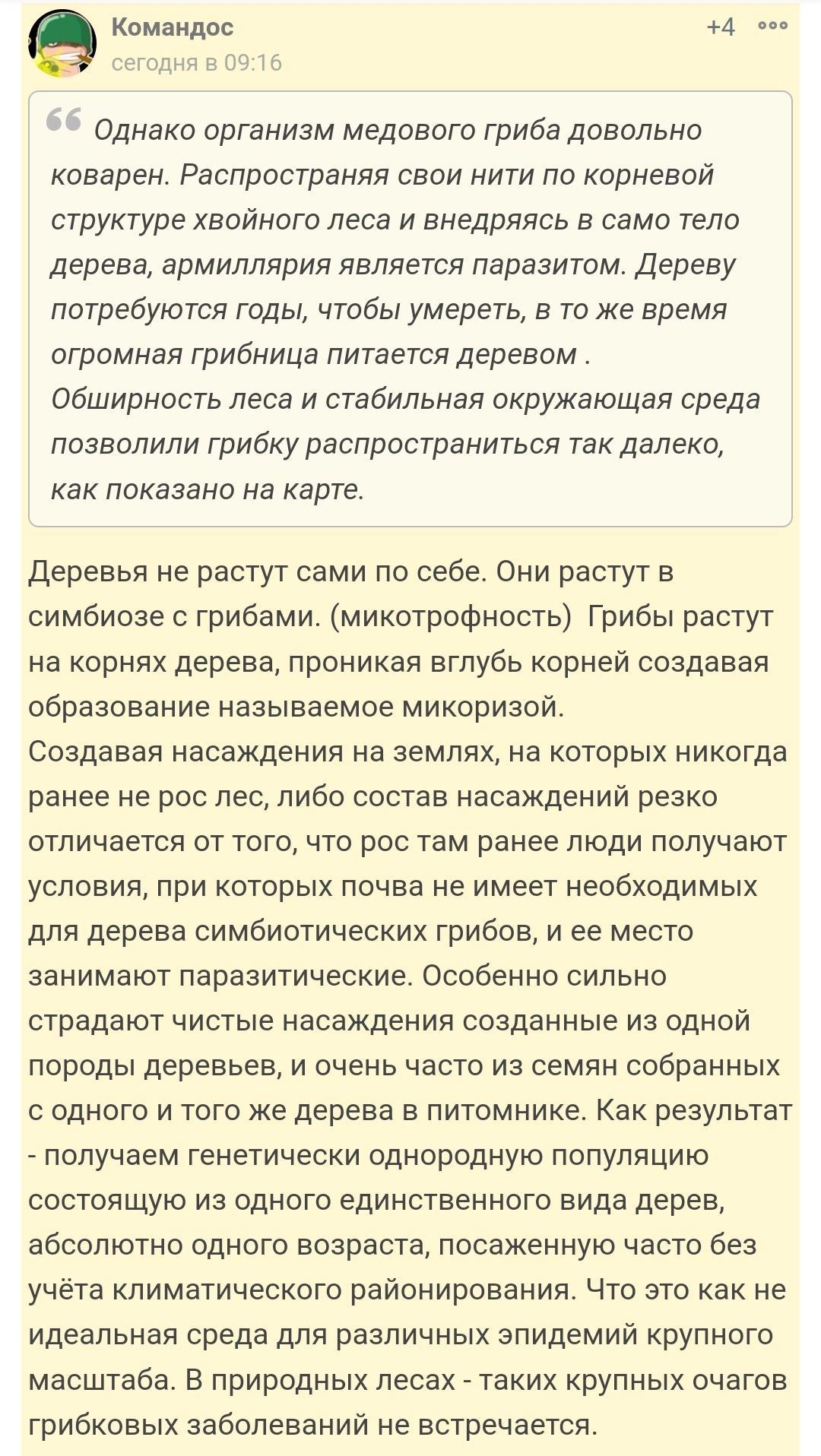 Однако организм медового гриба довольно коварен. Распространяя свои нити по корневой структуре хвойного леса и внедряясь в само тело дерева, армиллярия является паразитом. Дереву потребуются годы, чтобы умереть, в то же время огромная грибница питается деревом . Обширность леса и стабильная окружающая среда позволили грибку распространиться так далеко, как показано на карте.