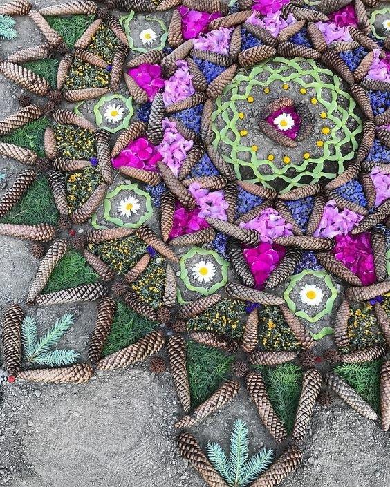 Конечно же, это первая образовательная область, о которой подумали педагогически настроенные взрослые: ввести практику лэнд-арта в художественные классы. Листья, шишки, веточки, камни - это все такие же материалы для создания картин как краски или карандаши. С лэнд-артом можно изучать разные стили и смыслы в искусстве, особенно хорошо даются абстрактные. Попробуйте выложить градиент из листьев, чтобы увидеть всю палитру возможных цветов в природе. Прекрасно выкладываются такие вещи как мандалы, спирали Фибоначчи, прорабатываются понятия симметрии, ассиметрии, пропорции, композиции…